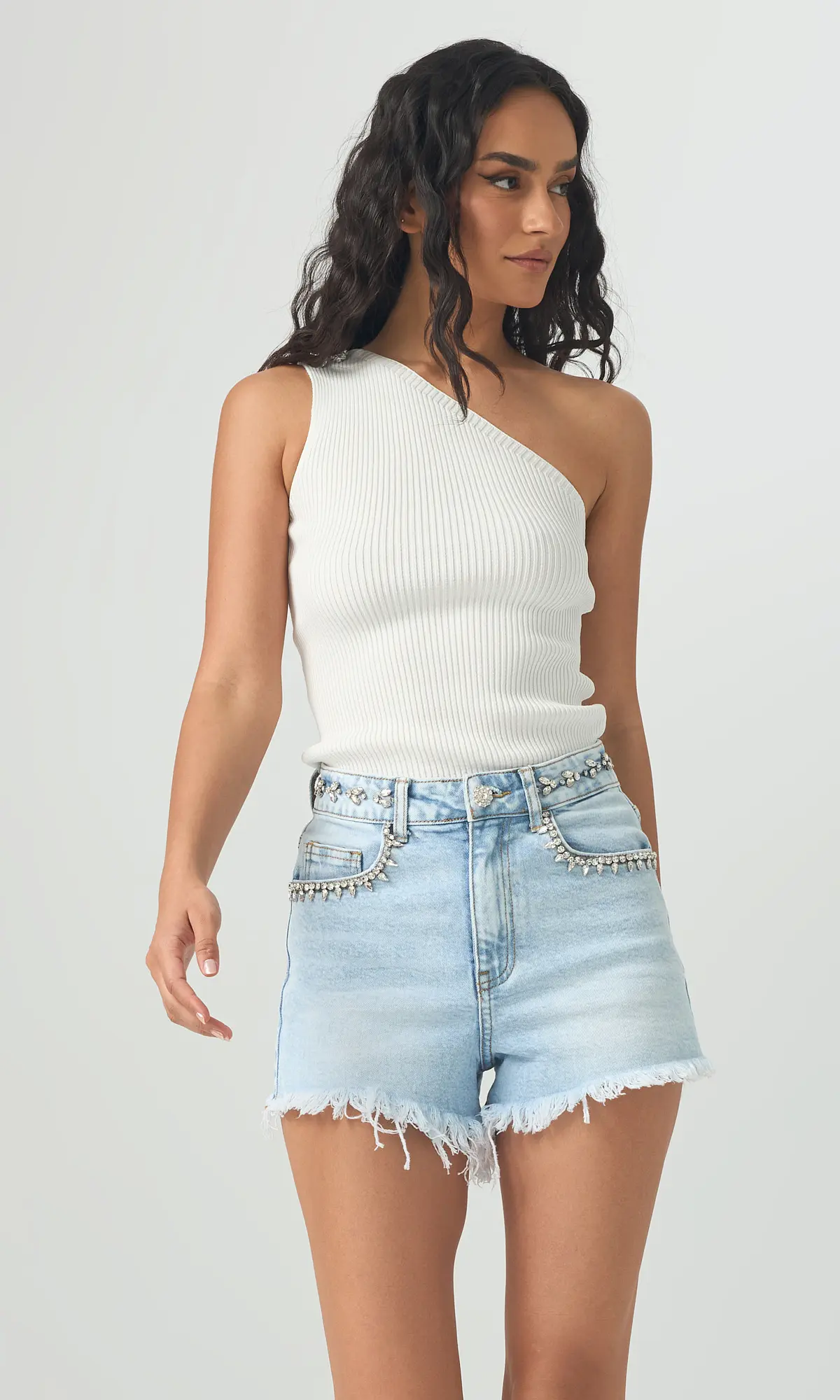 Τοπ ripped Ελαστικό με έναν ώμο. Πάνω στον ώμο έχει κουμπιά διακοσμητικά και καλύπτει εως Large