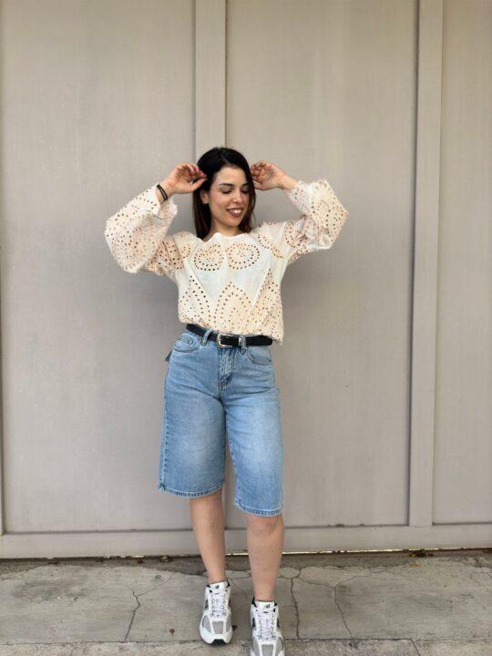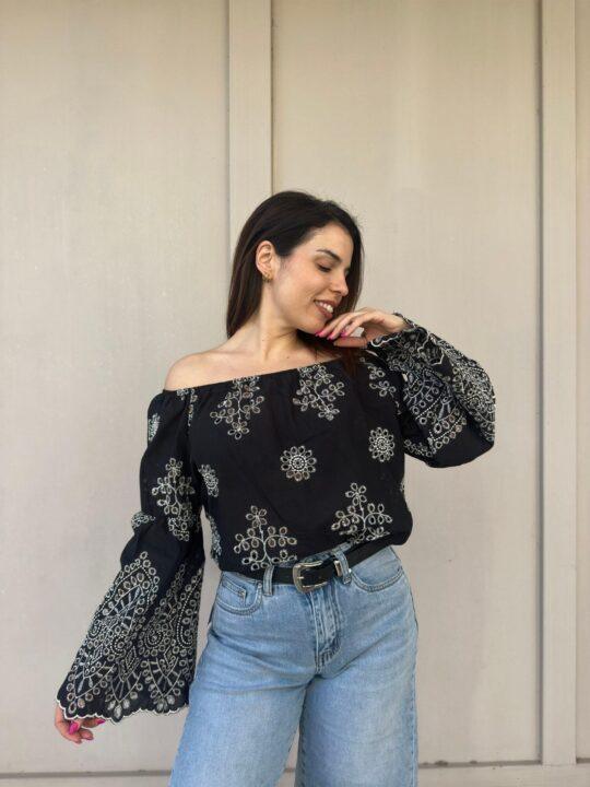 Μπλούζα κηπούρ σε άνετη γραμμή. Στο πάνω μέρος κάνει χαμόγελο και έχει λάστιχο. Κάνει μανίκι καμπάνα. Είναι one size και καλύπτει έως Large