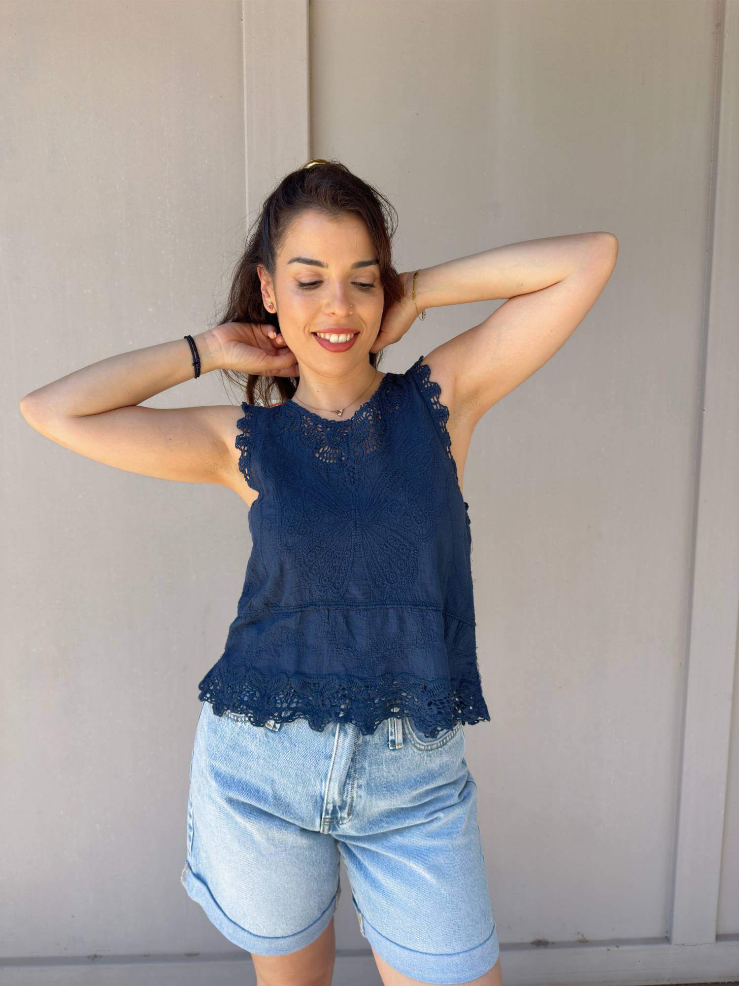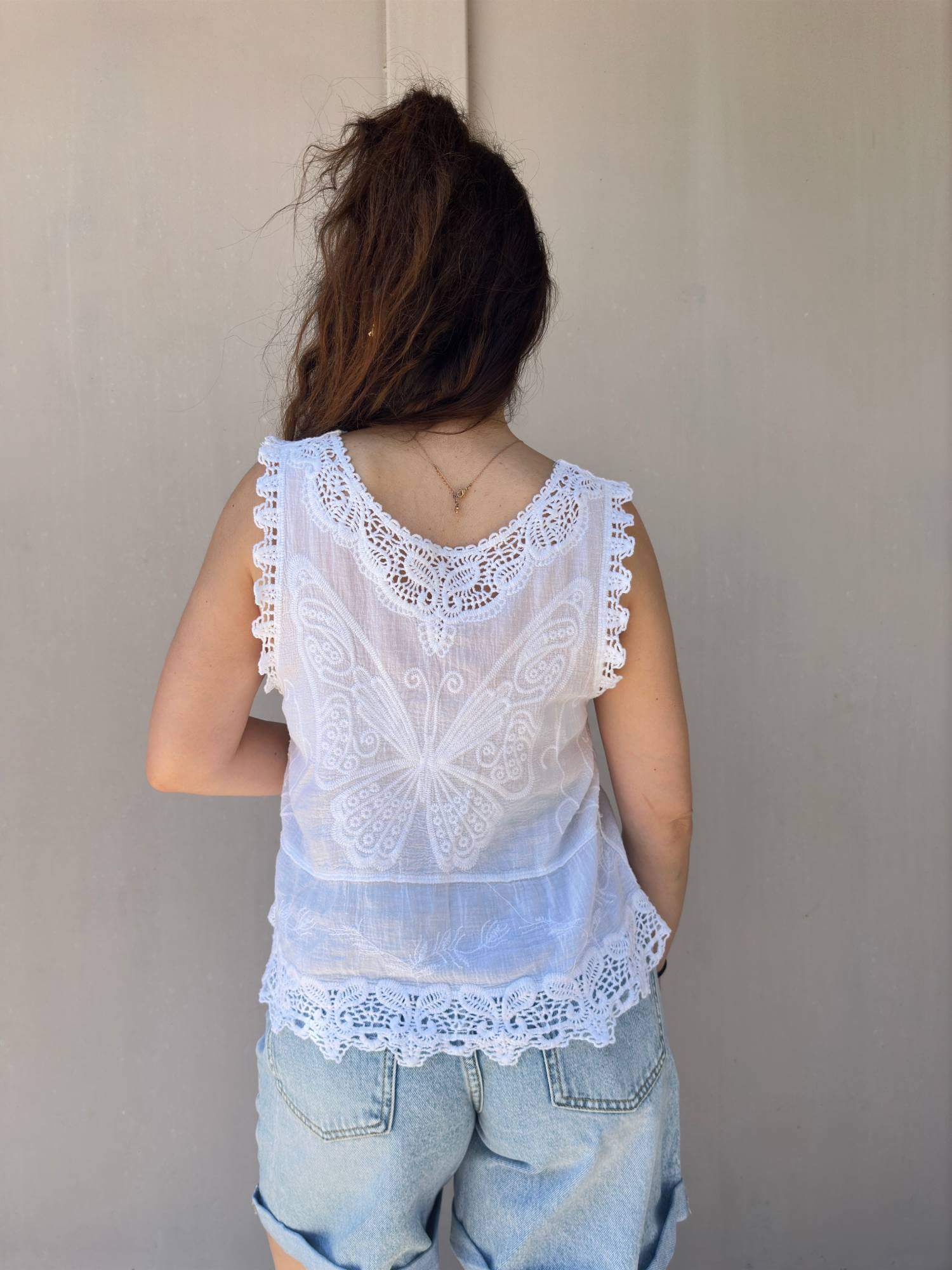 Μπλουζάκι αμάνικο με κηπούρ λεπτομέρειες. Είναι one size και καλύπτει έως Large.