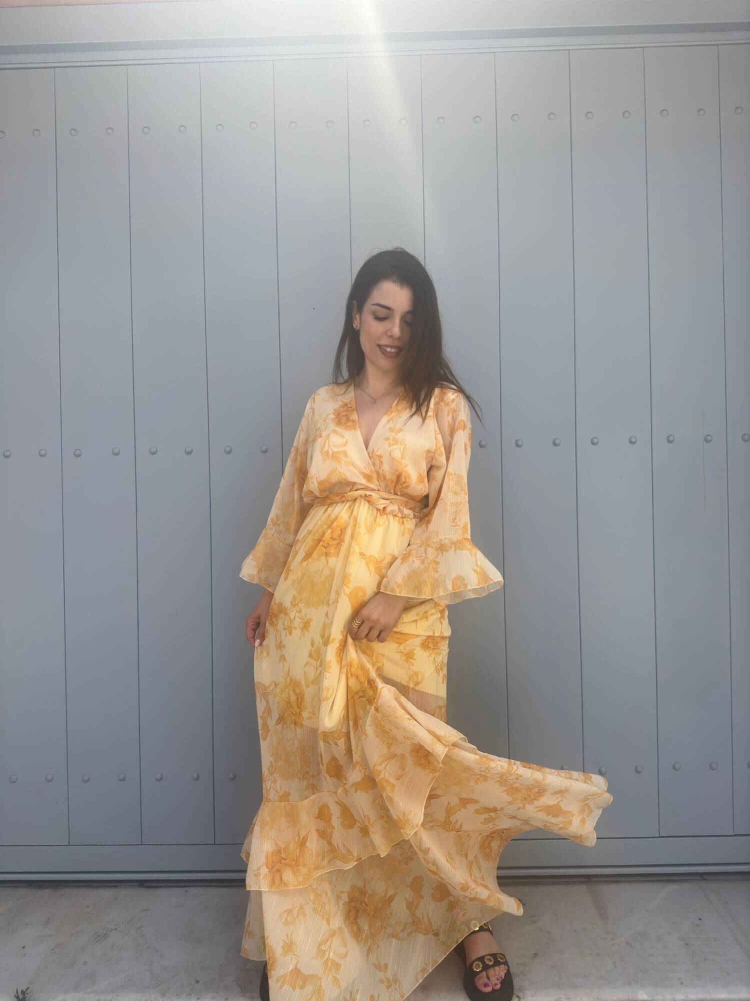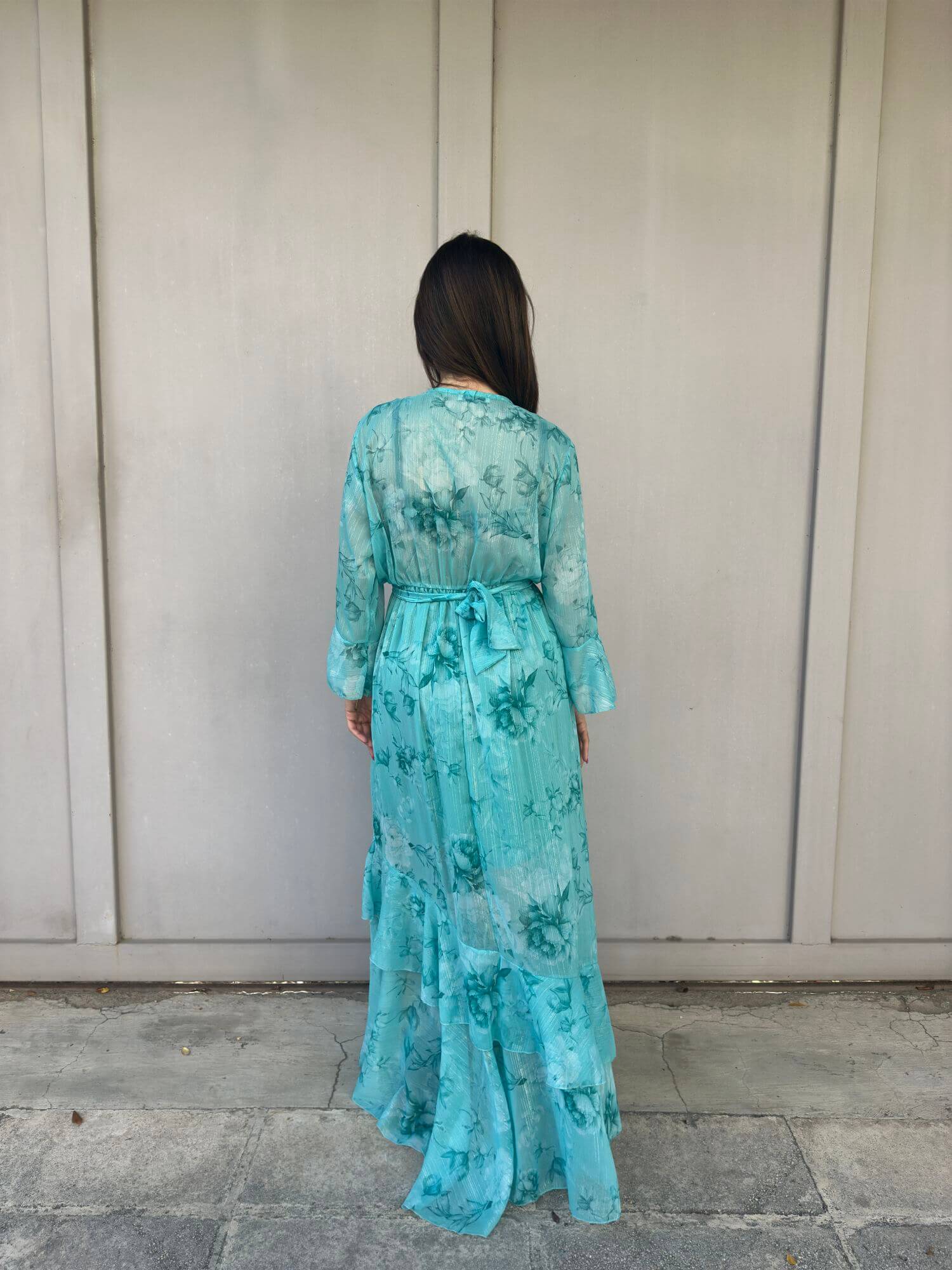 Φόρεμα φλοράλ σε ύφασμα ζορζέτα. Έχει λεπτομέρια ασημοκλωστή, στο στήθος έχει λάστιχο και δένει πίσω.