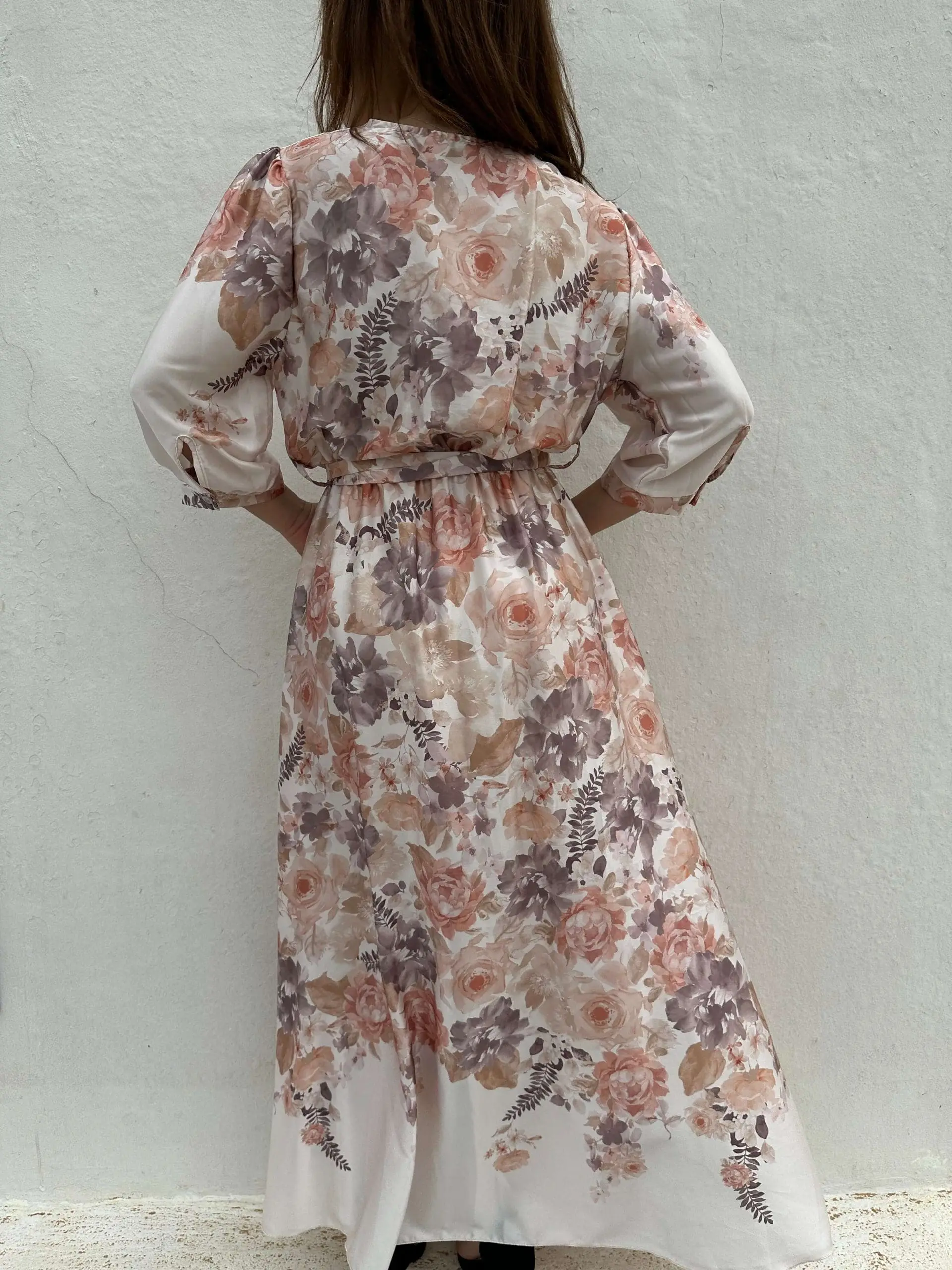 Φορεμα σατεν που κανει κρουαζε στο στηθος και διαθετει δικη του ζωνη. Ειναι One size και καλυπτει εως X-Large