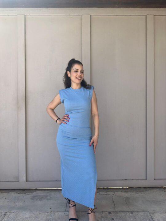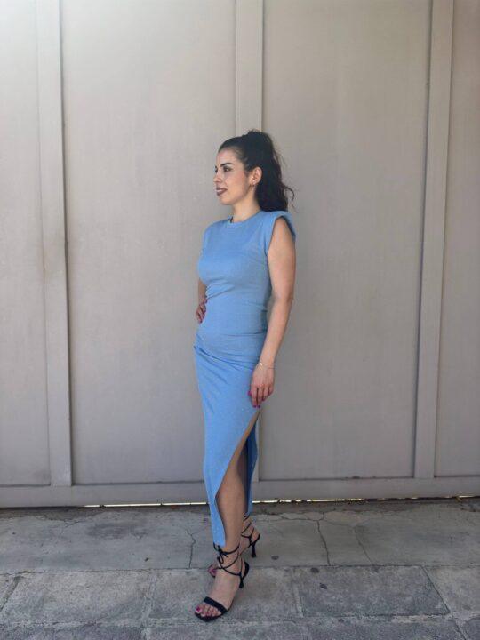 Φόρεμα στενό ριπ ελαστικό με στρας. Έχει βάτες στους ώμους και σκίσιμο στο πλάι. Καλύπτει έως Large