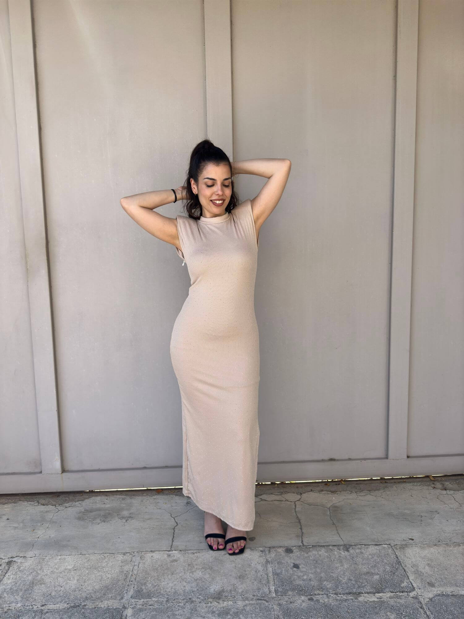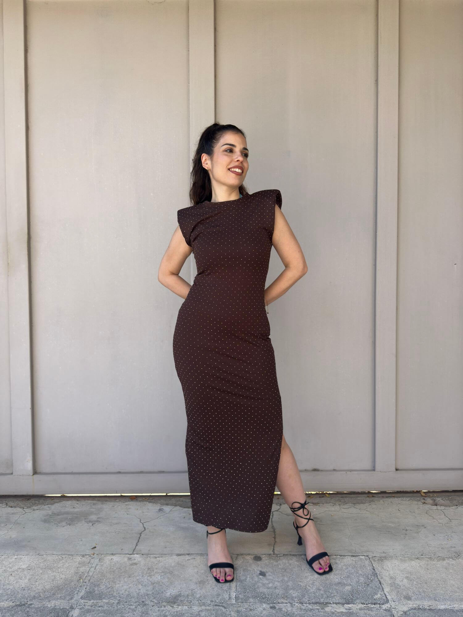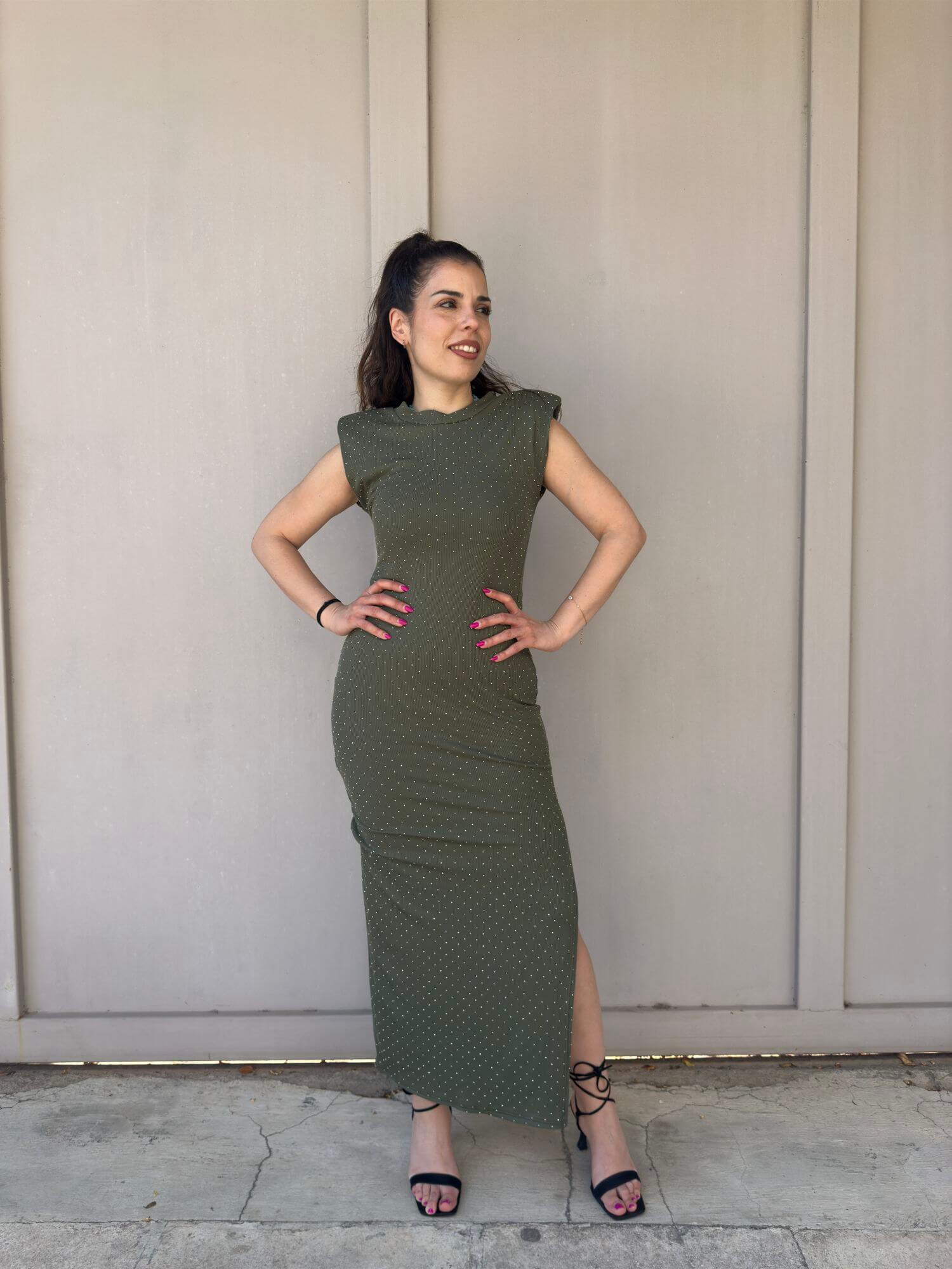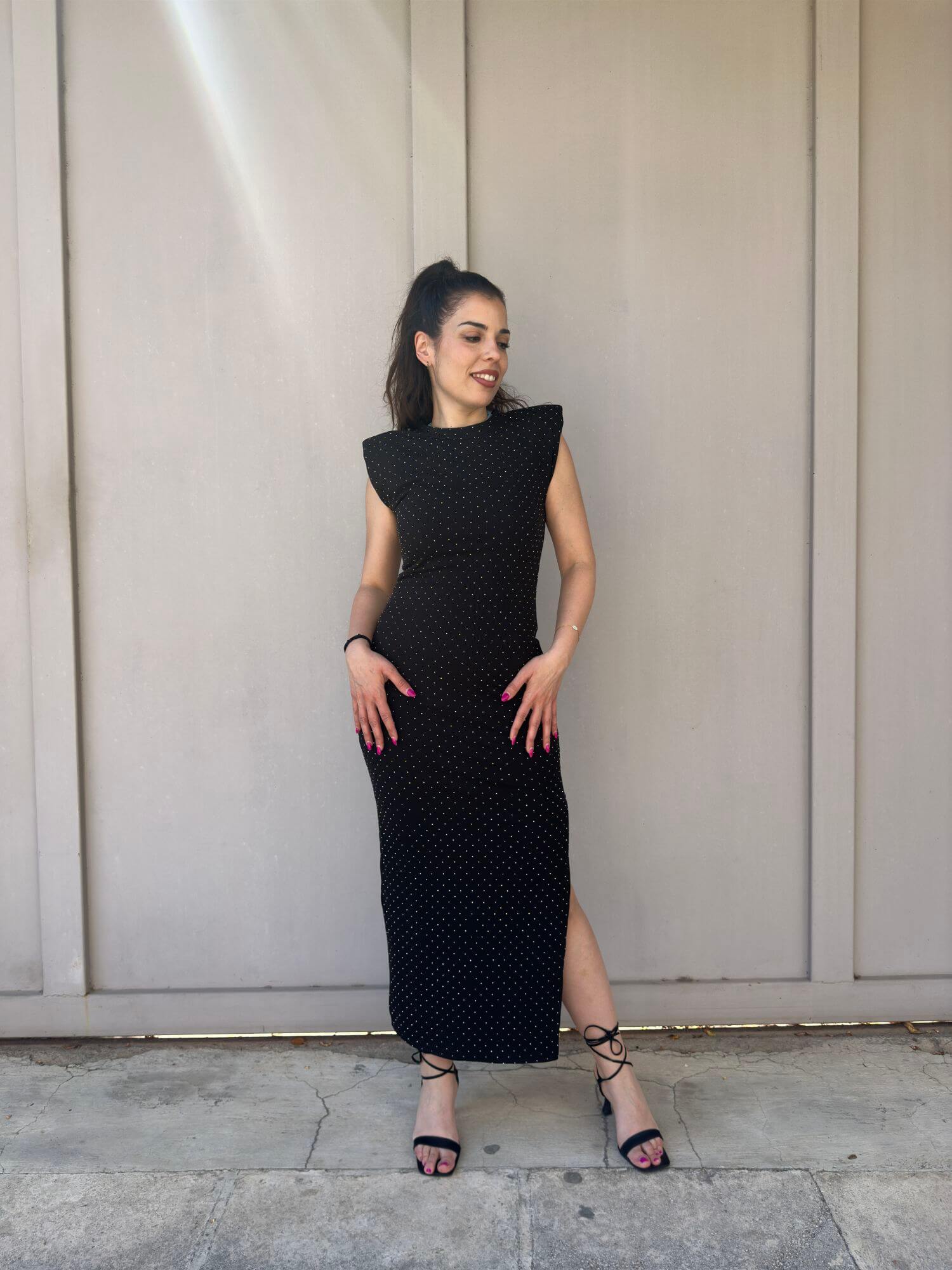 Φόρεμα στενό ριπ ελαστικό με στρας. Έχει βάτες στους ώμους και σκίσιμο στο πλάι. Καλύπτει έως Large