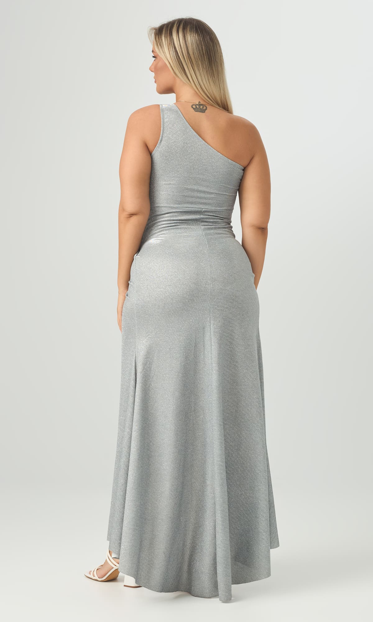 Φόρεμα με έναν ώμο ελαστικό, κάνει σούρα στην κοιλιά και στο κάτω μέρος πέφτει το ένα ύφασμα πάνω από το άλλο. Καλύπτει έως large.