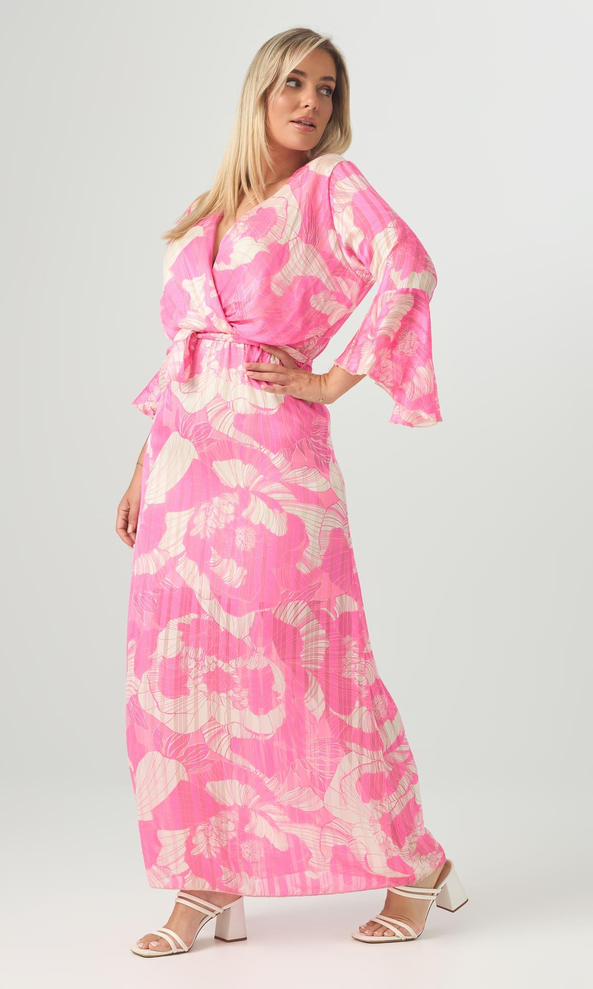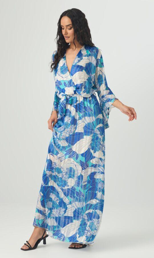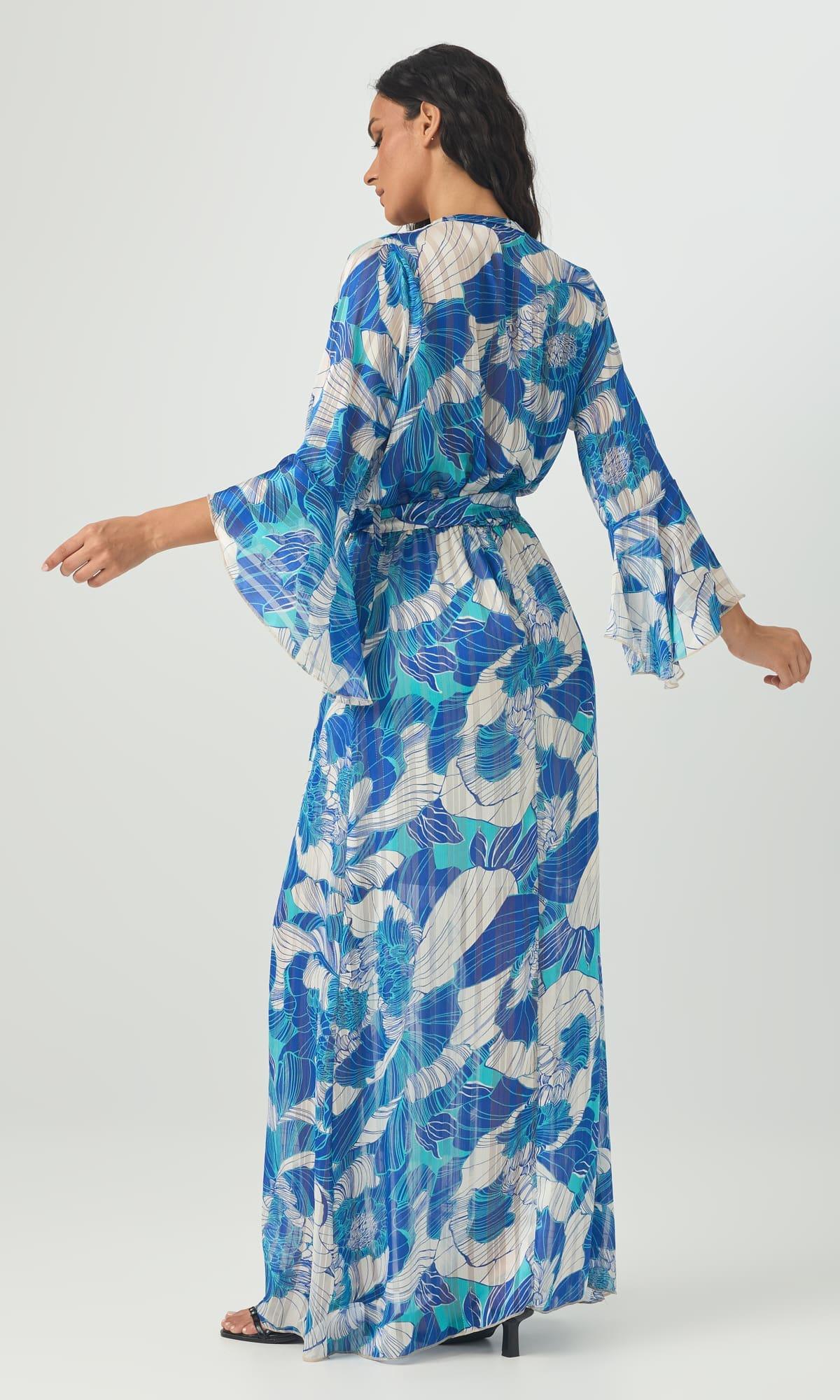 Φόρεμα σε ύφασμα μουσελίνα με λεπτομέρεια χρυσοκλωστή.Έχει καμπάνα μανίκια και στο στήθος κάνει κρουαζέ.Διαθέτει εσωτερική φόδρα και δική του ζώνη.Καλύπτει εως Xl