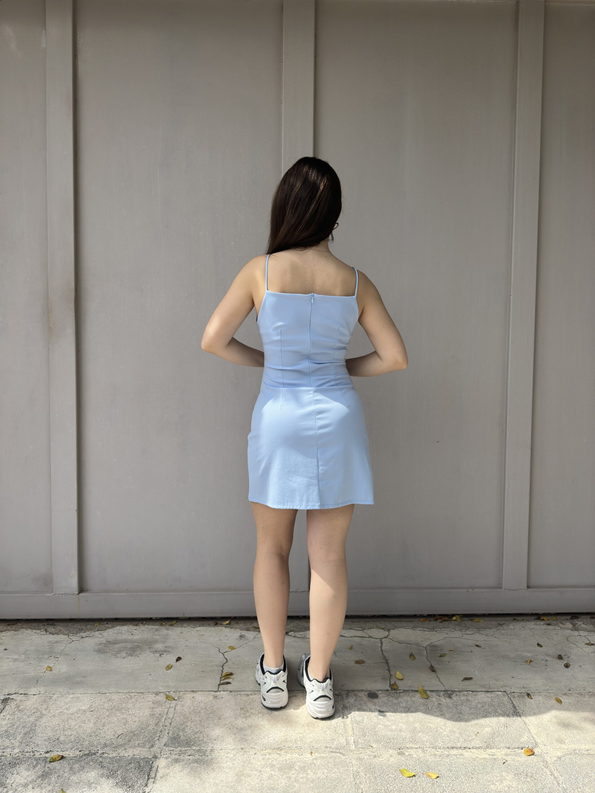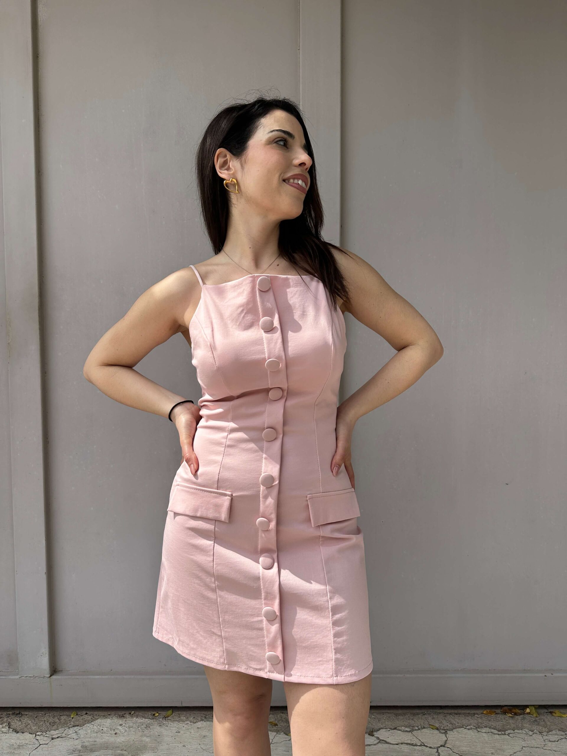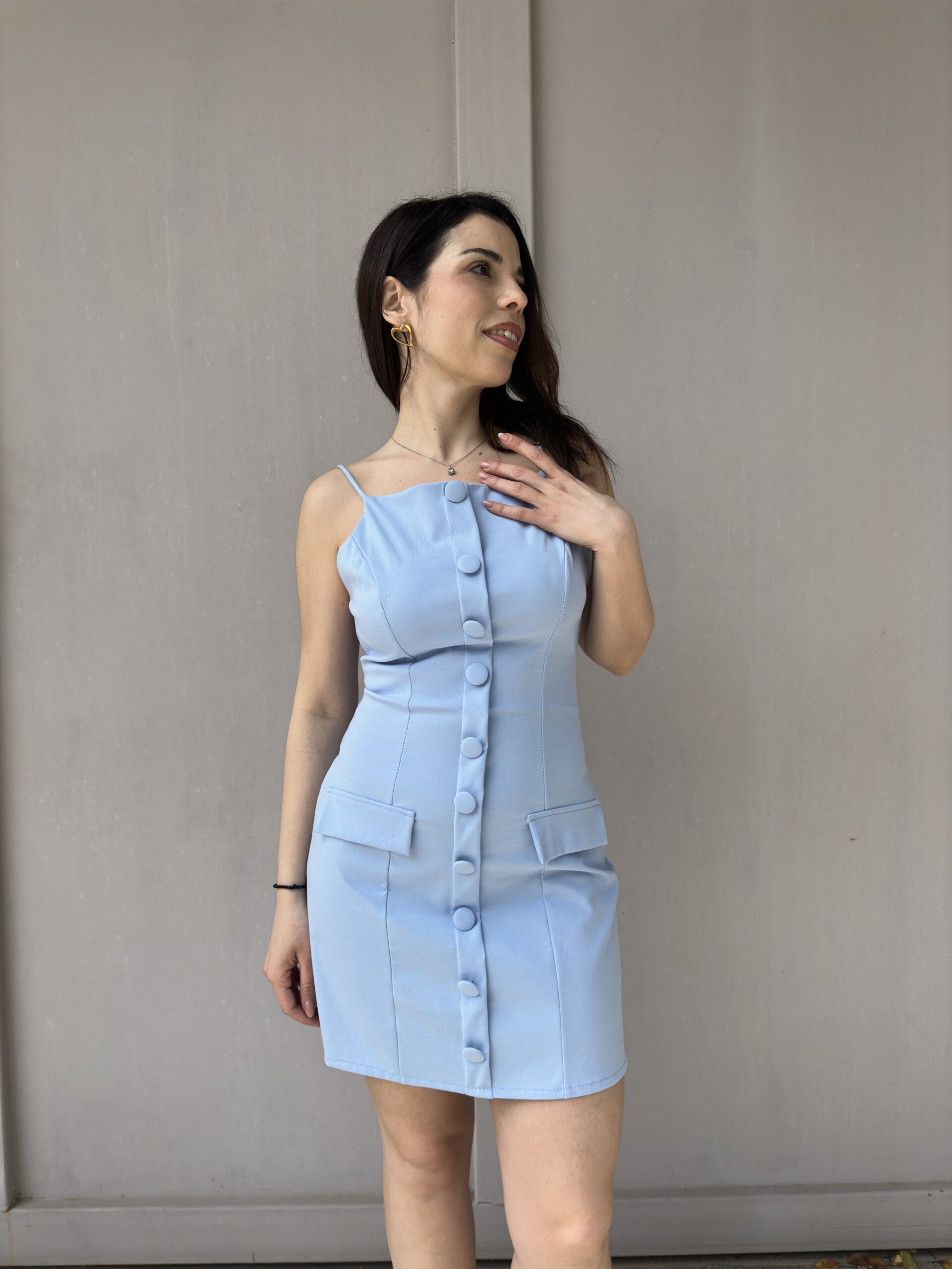 Φόρεμα σε στενή γραμμή, ελαστικό. Έχει κουμπιά εφέ και κλείνει με φερμουάρ πίσω. Είναι one size και καλύπτει μέχρι Large.