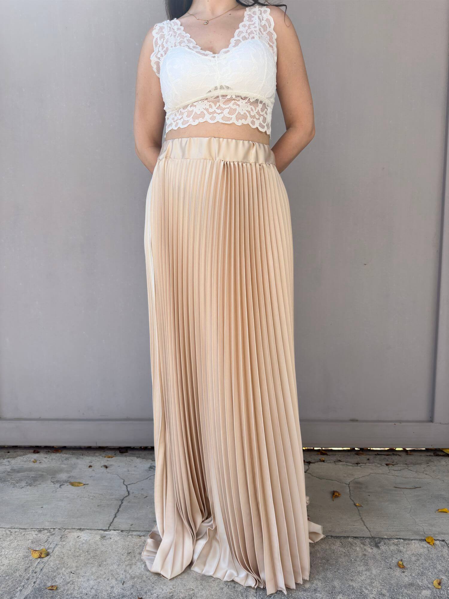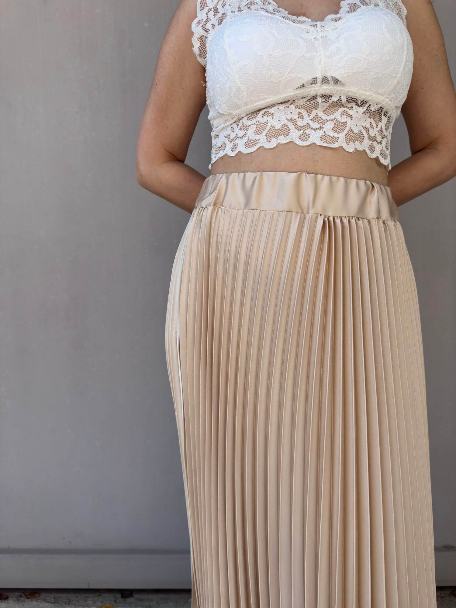 φούστα πλισέ σε σατέν ύφασμα .Στην μέση έχει λάστιχο και είναι πολύ άνετη.Είναι One size και καλύπτει εώς Large
