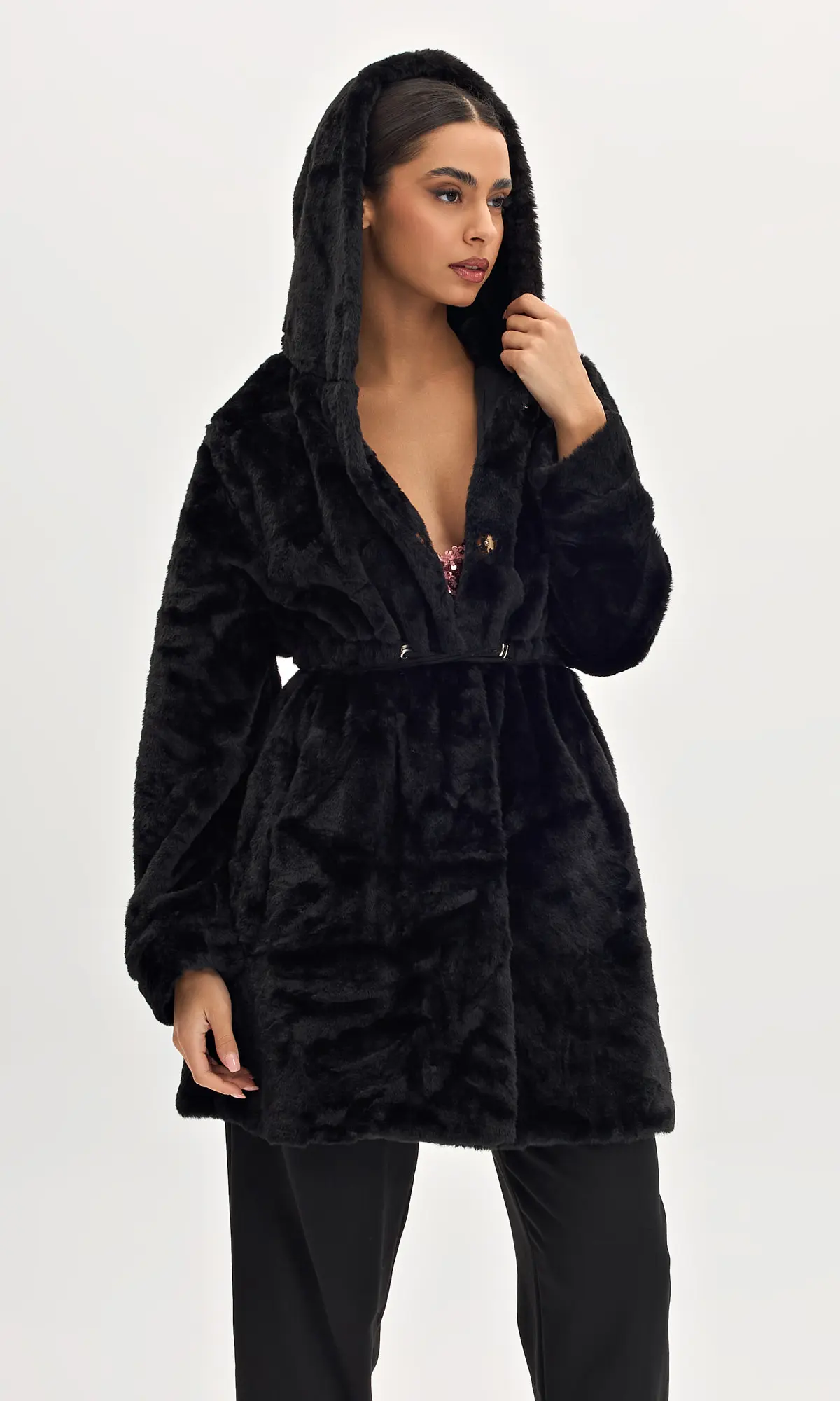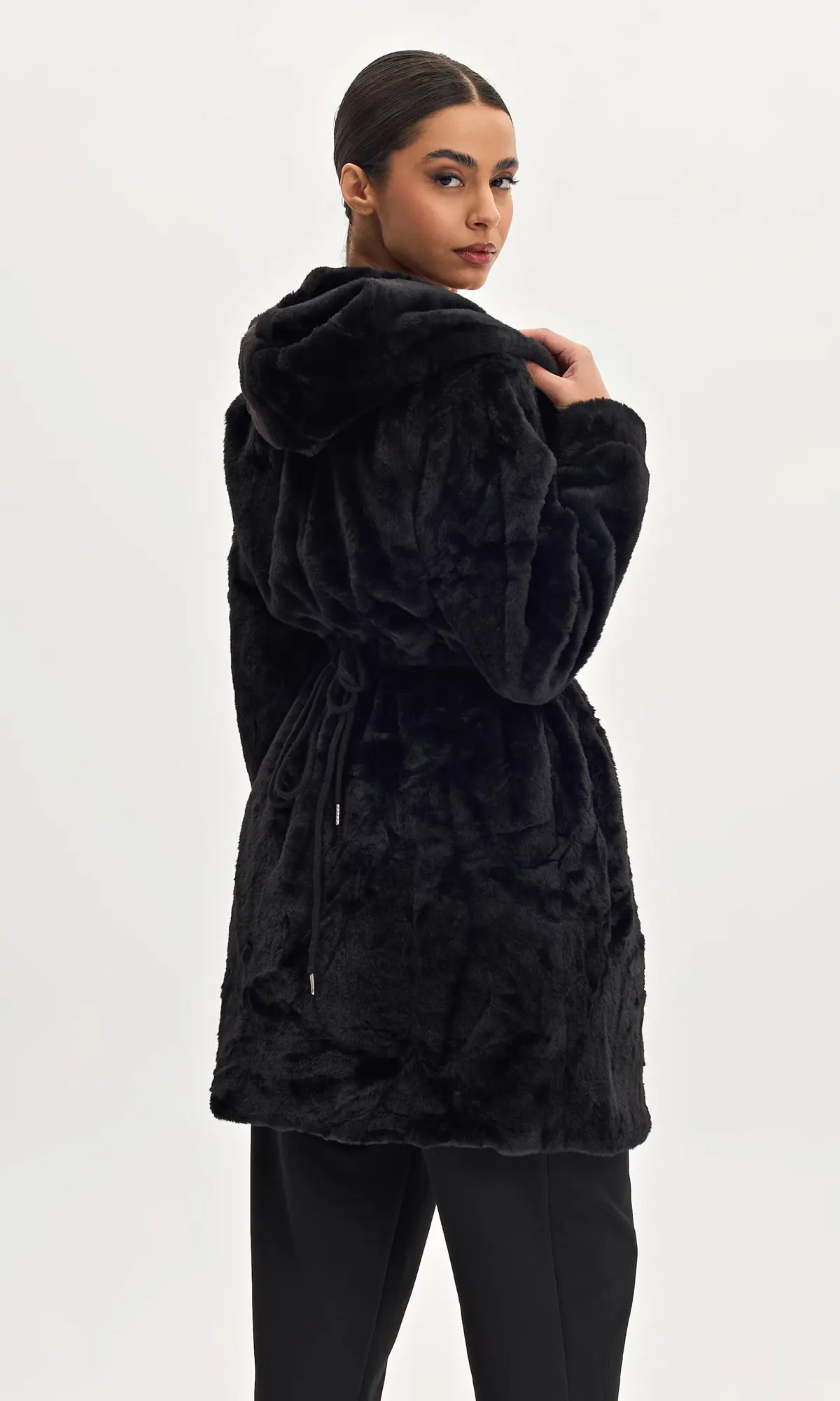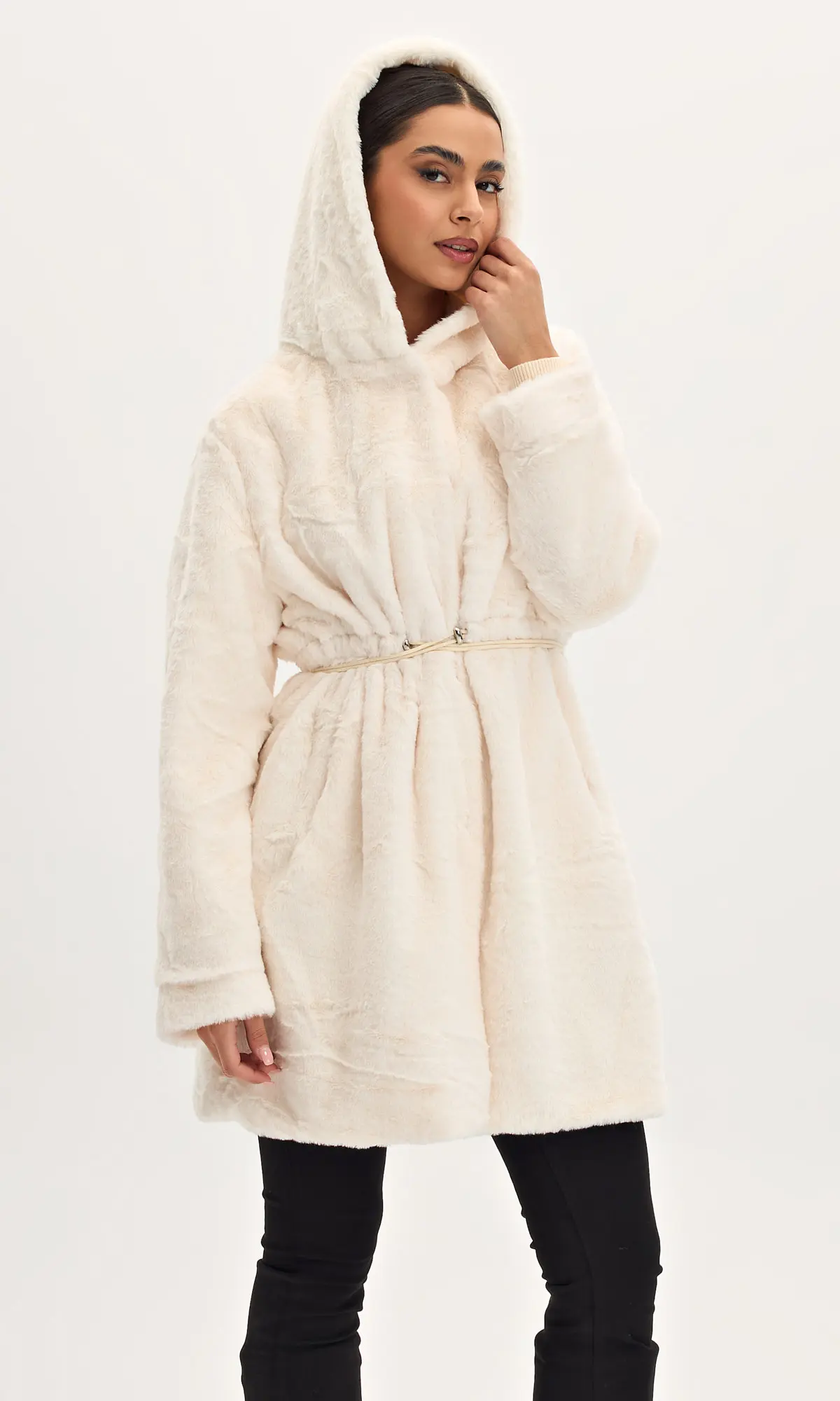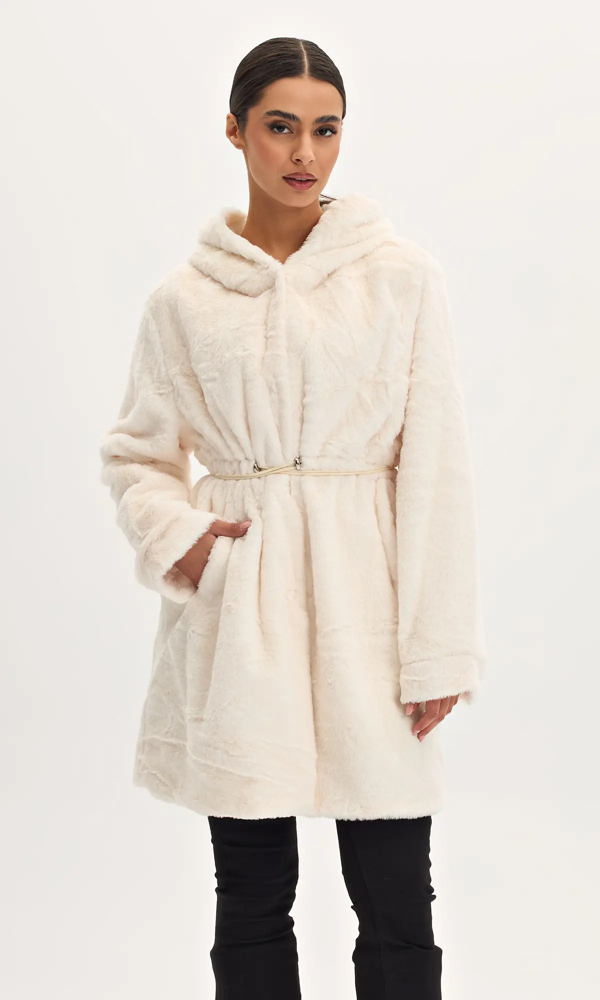 Γούνα οικολογική σε άνετη γραμμή.Διαθέτει κουμπιά κλιπς και κουκούλα. Στην μέση έχει κορδόνια ώστε να σφίγγει