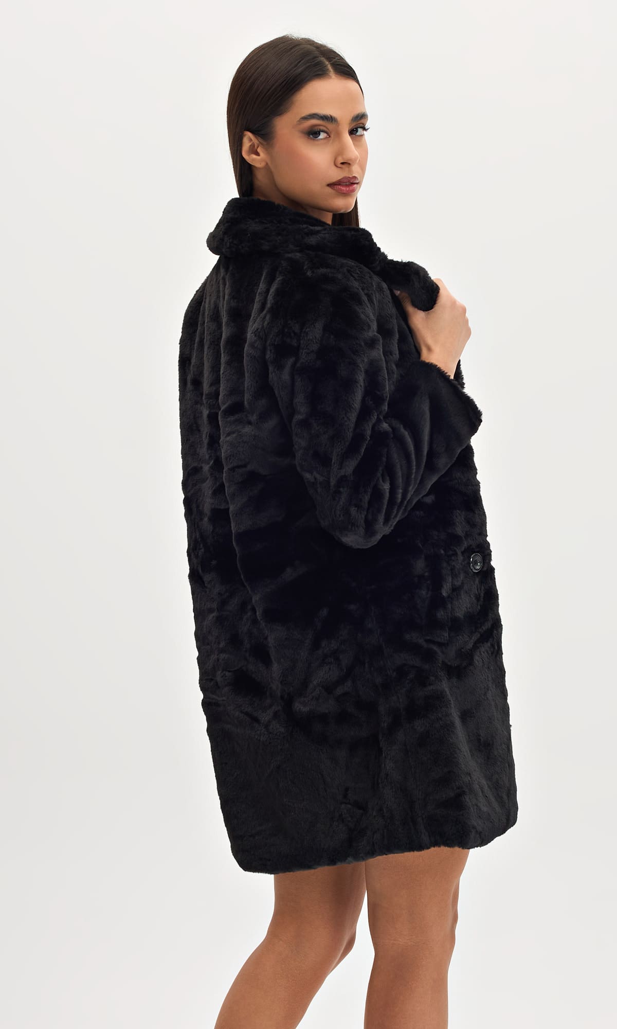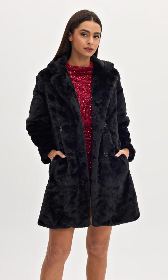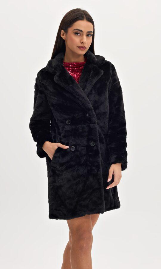 Γούνα οικολογική σε άνετη γραμμή. Έχει κούμπωμα τεσσάρων κουμπιών και διαθέτει εσωτερική φόδρα
