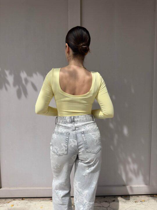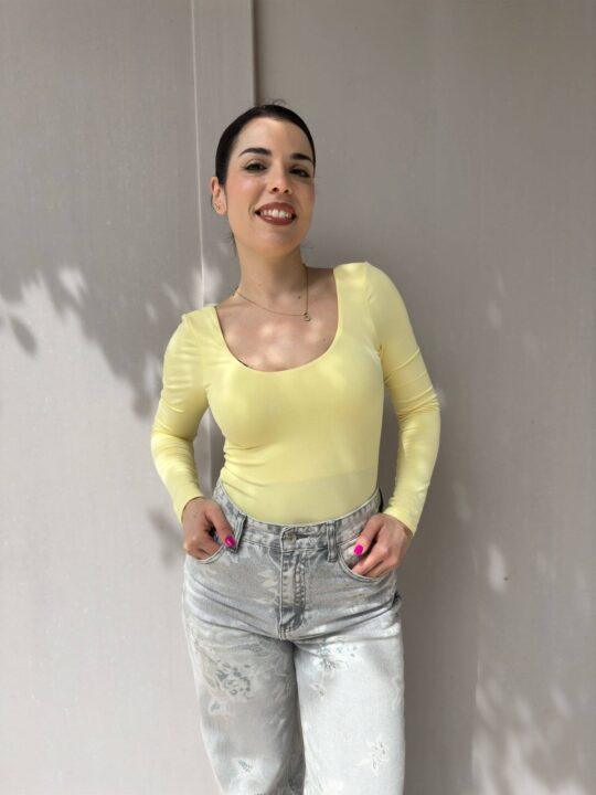 Κορμάκι με βαθιά λαιμόκοψη σε στενή γραμμή. Έχει αρκετή ελαστικότητα και καλύπτει έως large