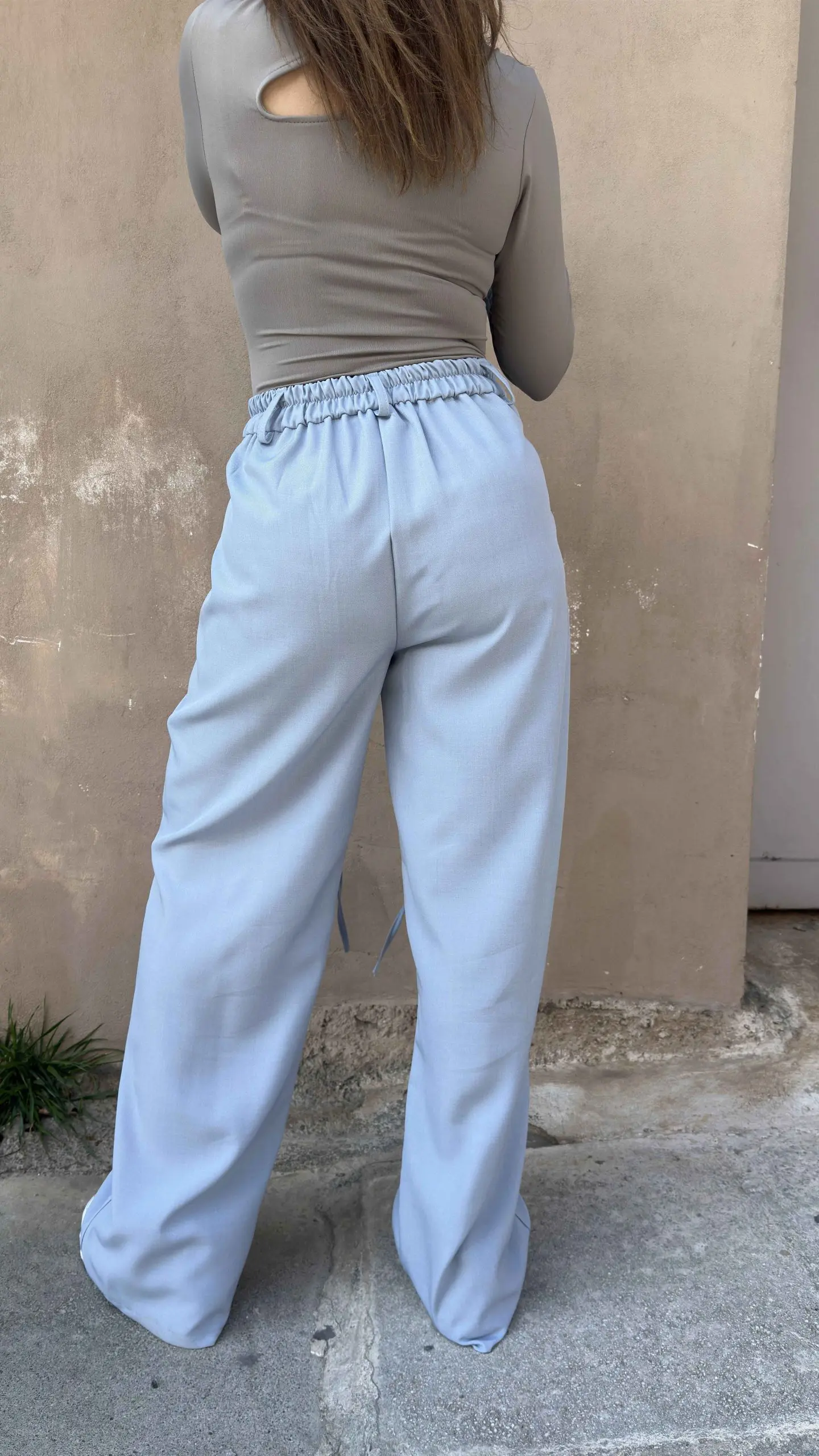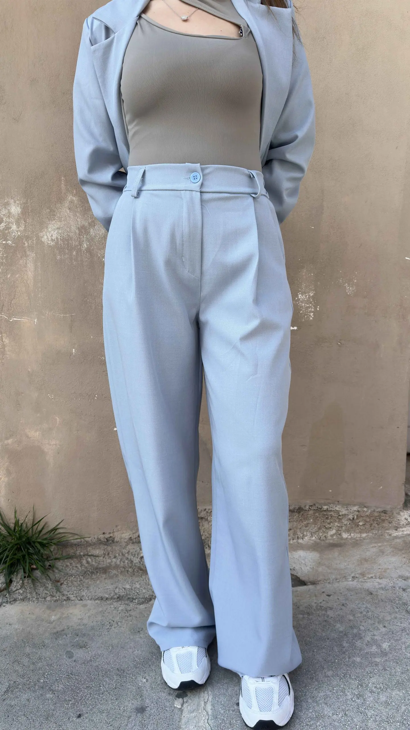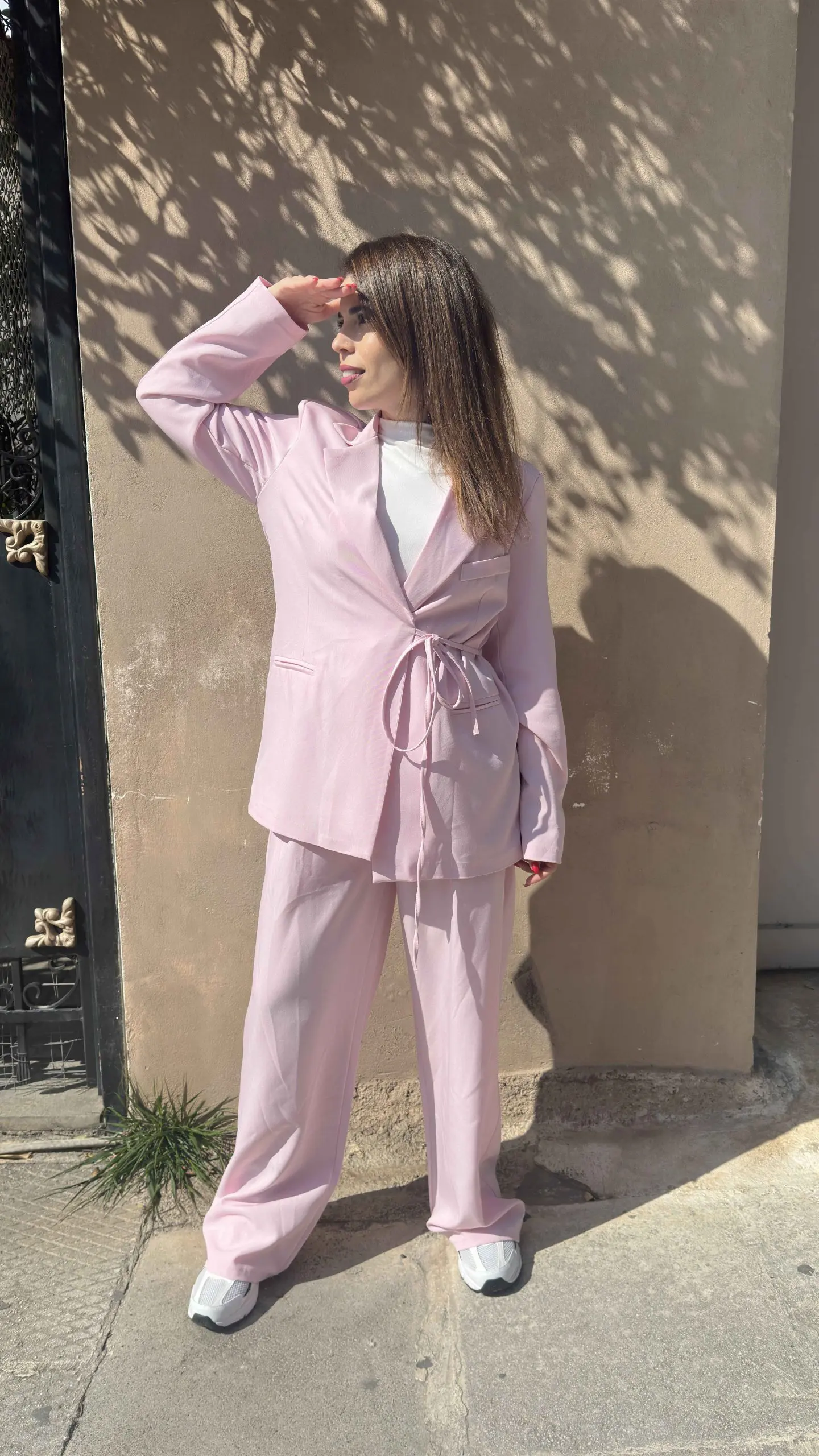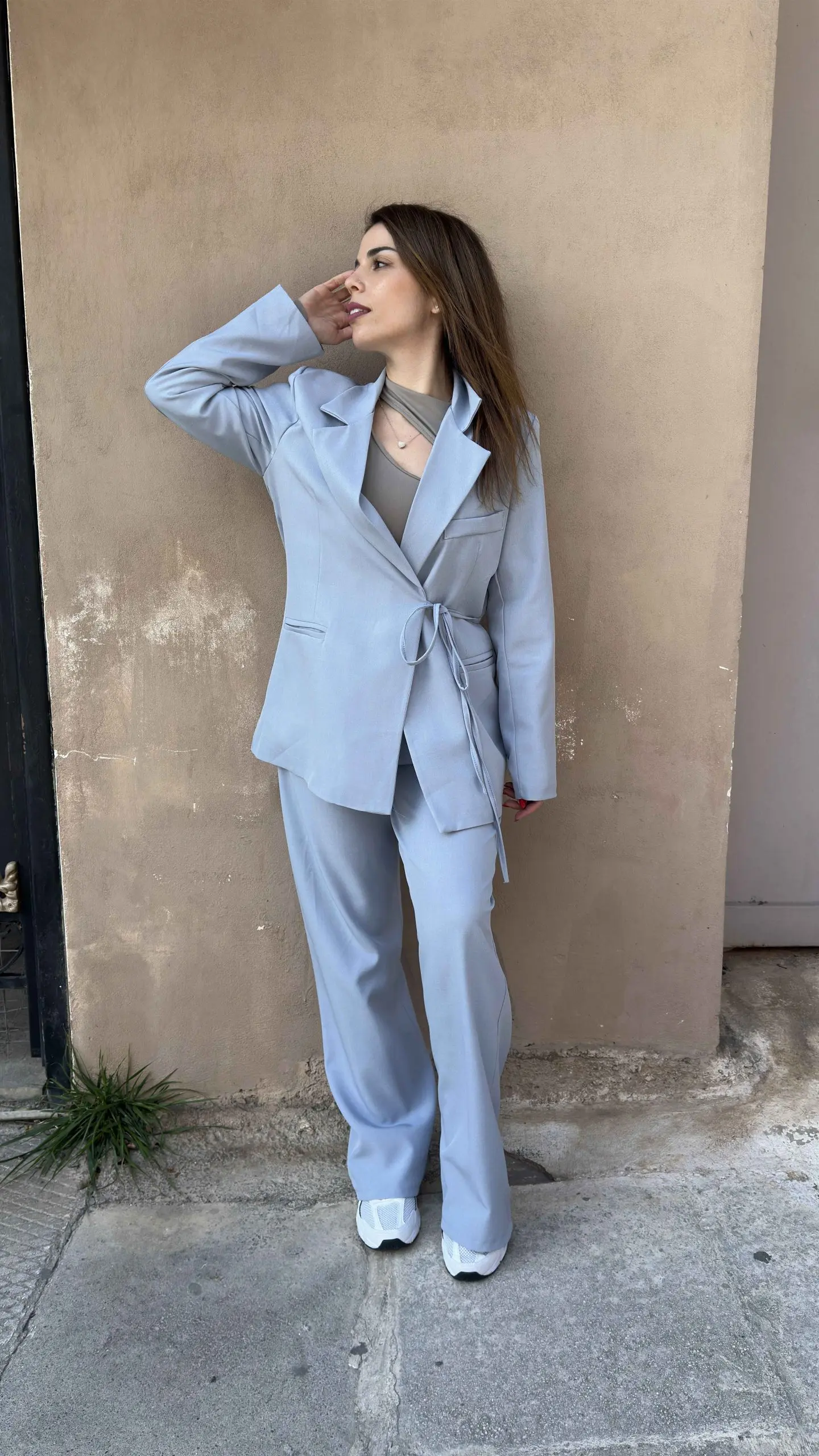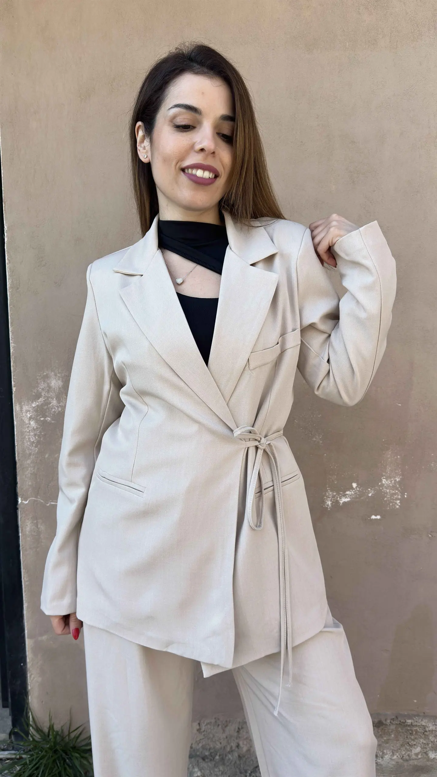 Σετ κουστούμι, που αποτελείται από σακάκι και παντελόνι. Το σακάκι δένει στο πλάι με κορδόνι και το παντελόνι είναι σε φαρδιά γραμμή. Είναι one size και καλύπτει έως Large