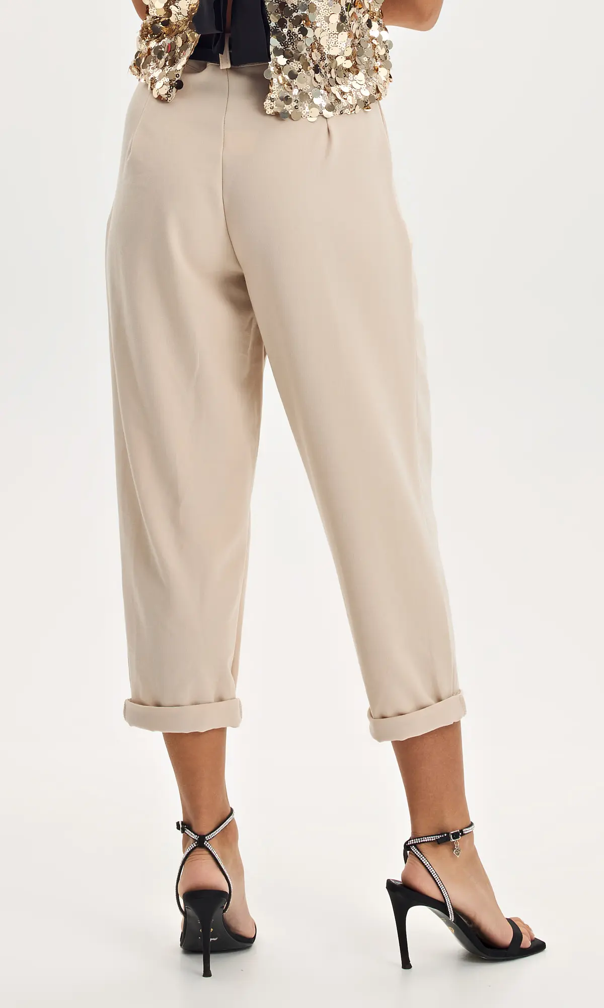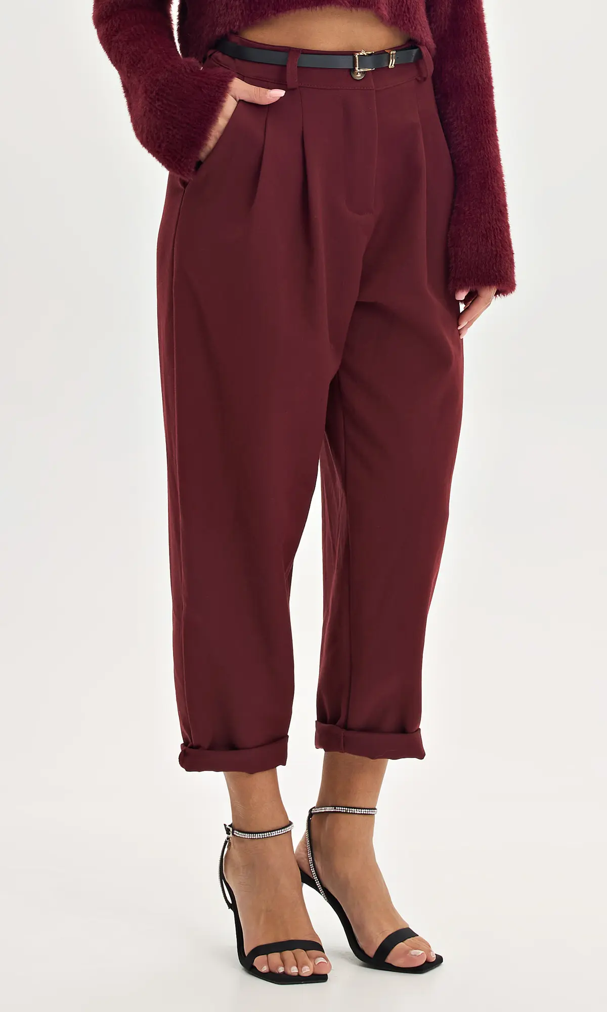 Παντελόνι υφασμάτινο mom fit. Στο μπροστινό μέρος έχει πιέτες και τσέπες. Διαθέτει δική του ζώνη.