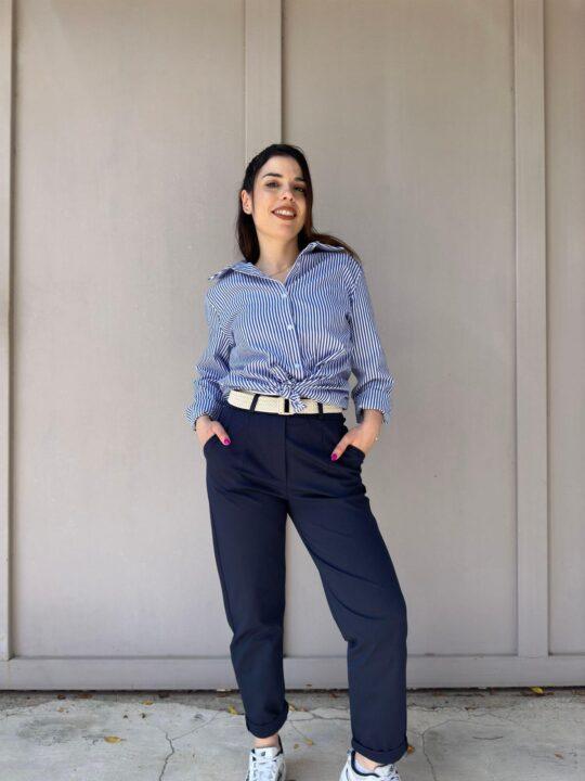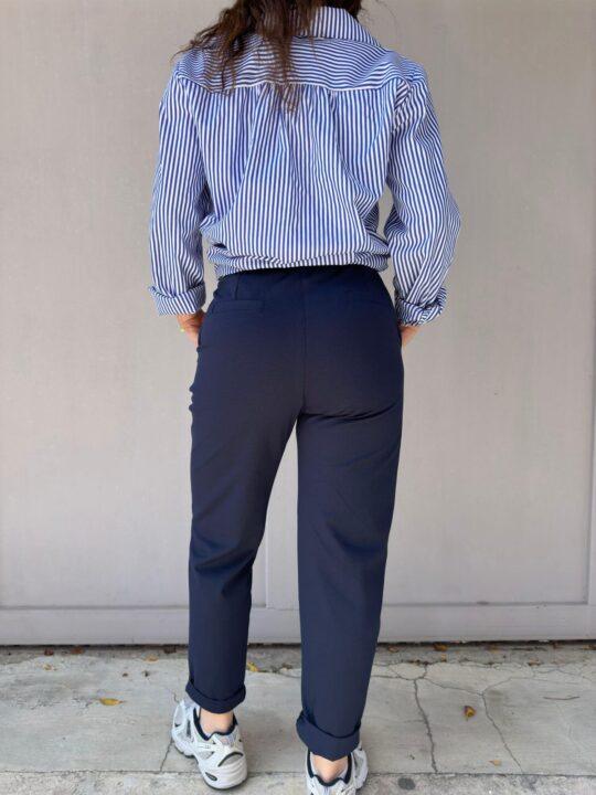Παντελόνι υφασμάτινο σε ίσια γραμμή. Στη μέση έχει λάστιχο και διαθέτει δική του ζώνη. Είναι βαμβακερό και ελαστικό και στο κάτω μέρος κάνει ρεβέρ.Βγαίνει απο small έως Χ-large