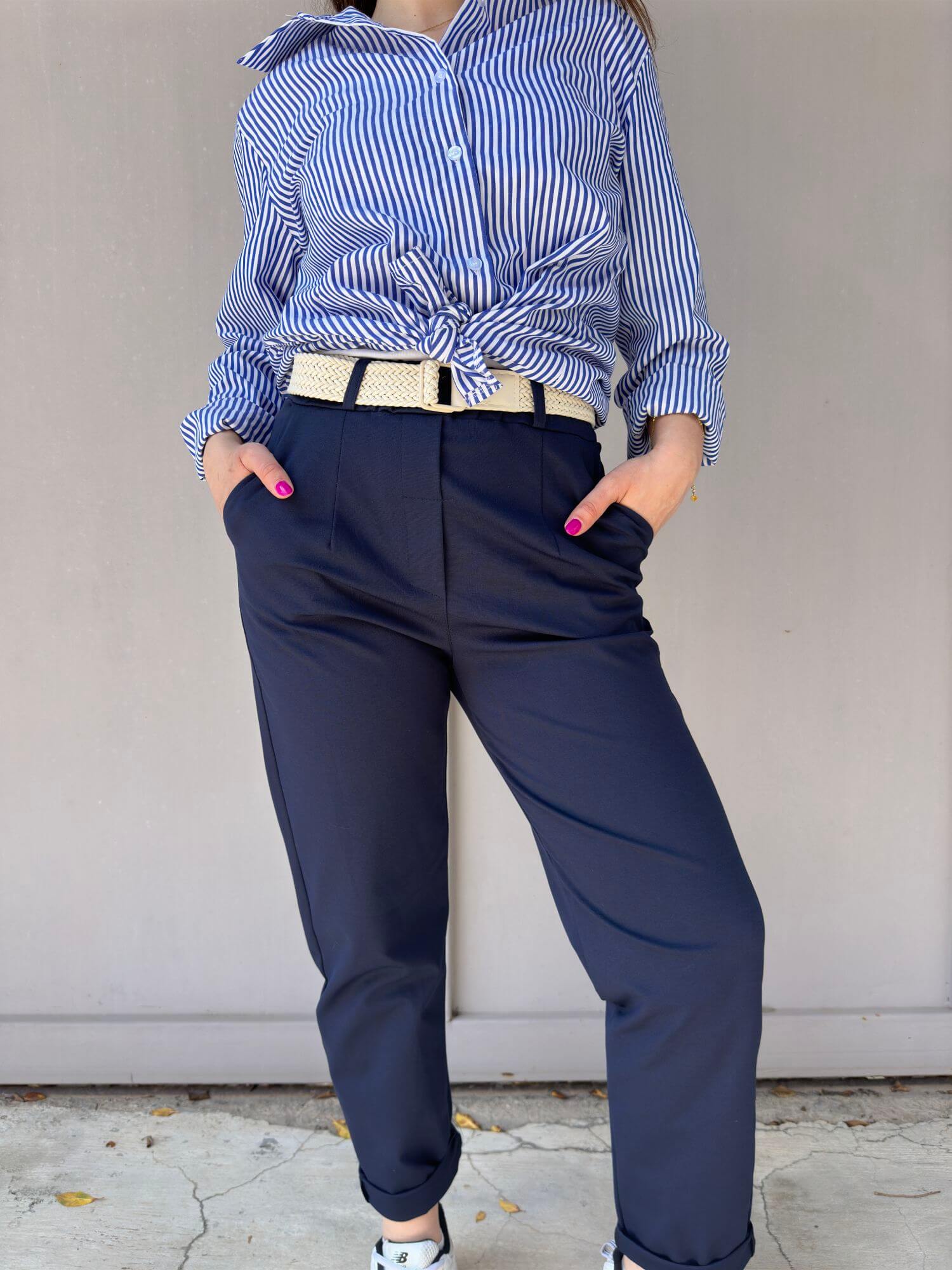 Παντελόνι υφασμάτινο σε ίσια γραμμή. Στη μέση έχει λάστιχο και διαθέτει δική του ζώνη. Είναι βαμβακερό και ελαστικό και στο κάτω μέρος κάνει ρεβέρ.Βγαίνει απο small έως Χ-large