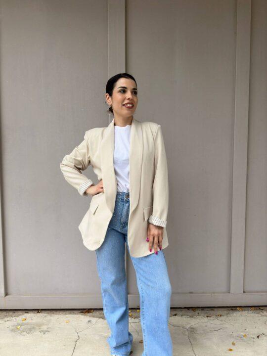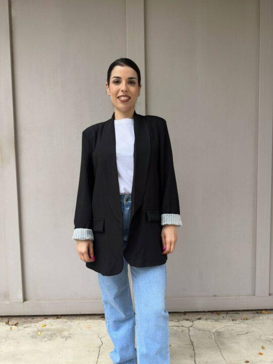 Σακάκι blazer one size σε άνετη γραμμή.Κάνει γύρισμα στο μανίκι και φαίνεται ρίγα. Καλύπτει έως extra Large