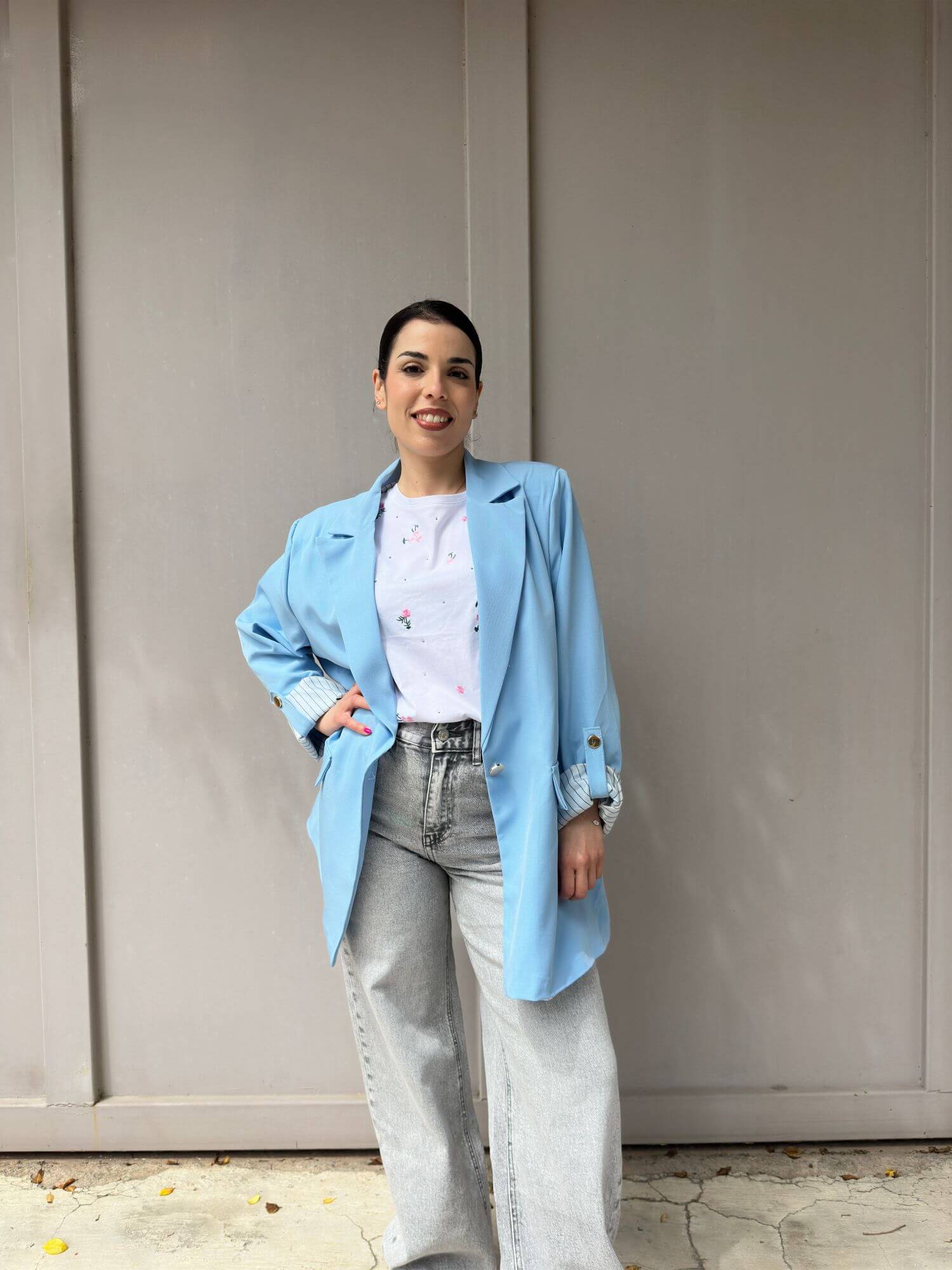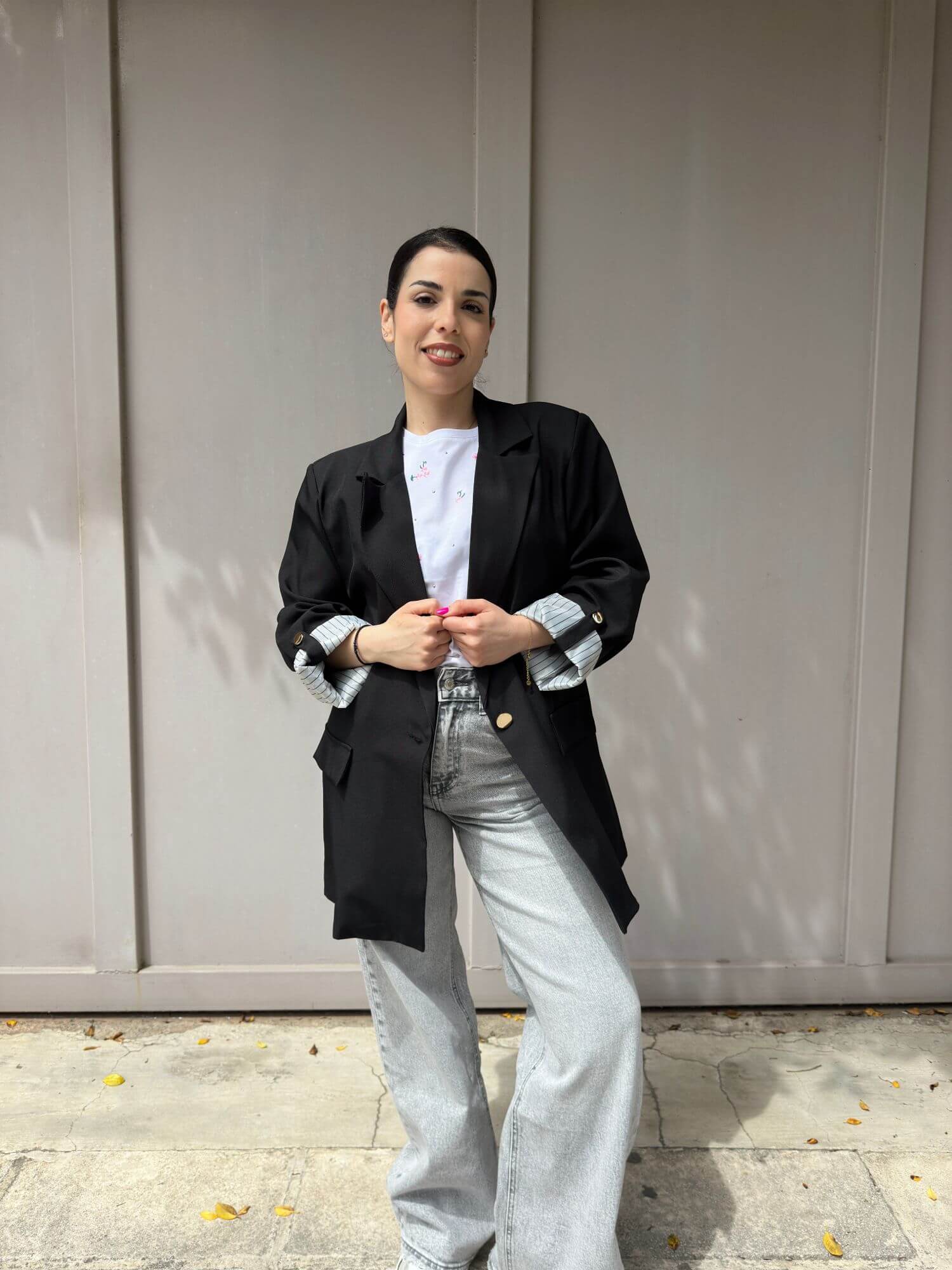 Σακάκι oversized σε άνετη γραμμή, κάνει rever το μανίκι και έχει φόδρα ριγέ. Είναι One size και καλύπτει έως extra Large.