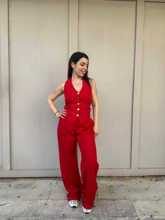 Σετ που αποτελείται από γιλέκο και παντελόνι. Το γιλέκο αφήνει την μισή πλάτη ανοιχτή και κλείνει μπροστά με χρυσά κουμπιά. Το Παντελόνι είναι σε στιλ παντελόνας σε άνετη γραμμή και πίσω έχει λάστιχο