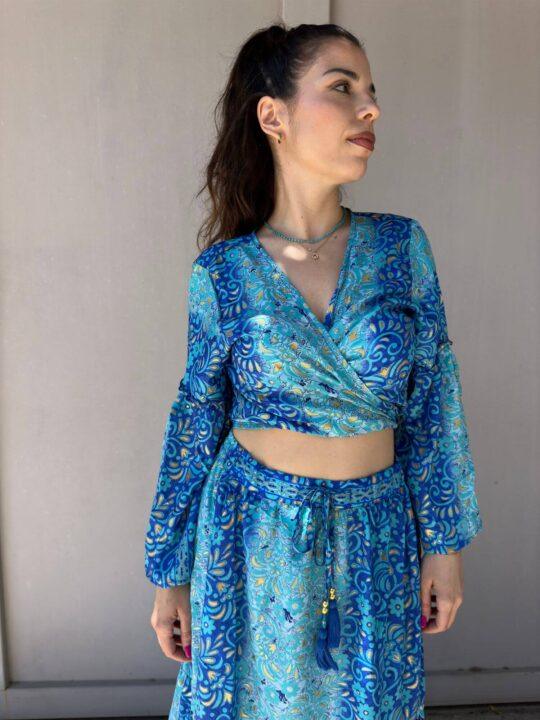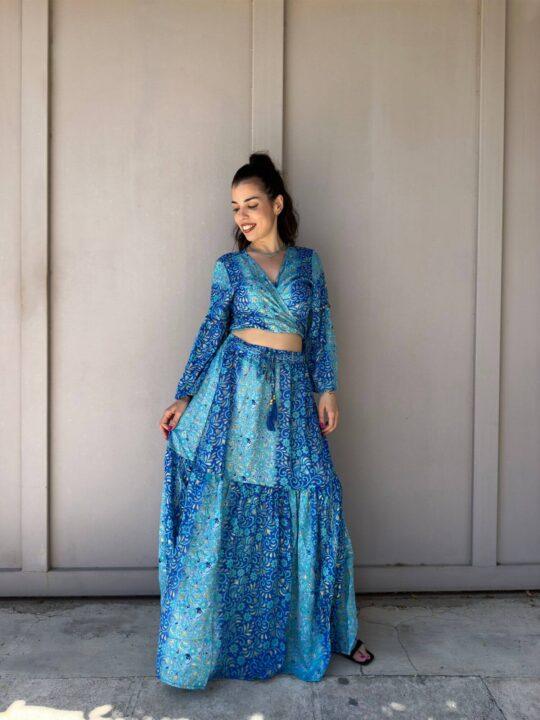 Σετ που αποτελείται από τοπ και φούστα σε άλφα γραμμή. Το ύφασμά του είναι μεταξωτό και η φούστα στην μέση έχει λάστιχο. Καλύπτει έως Xlarge.
