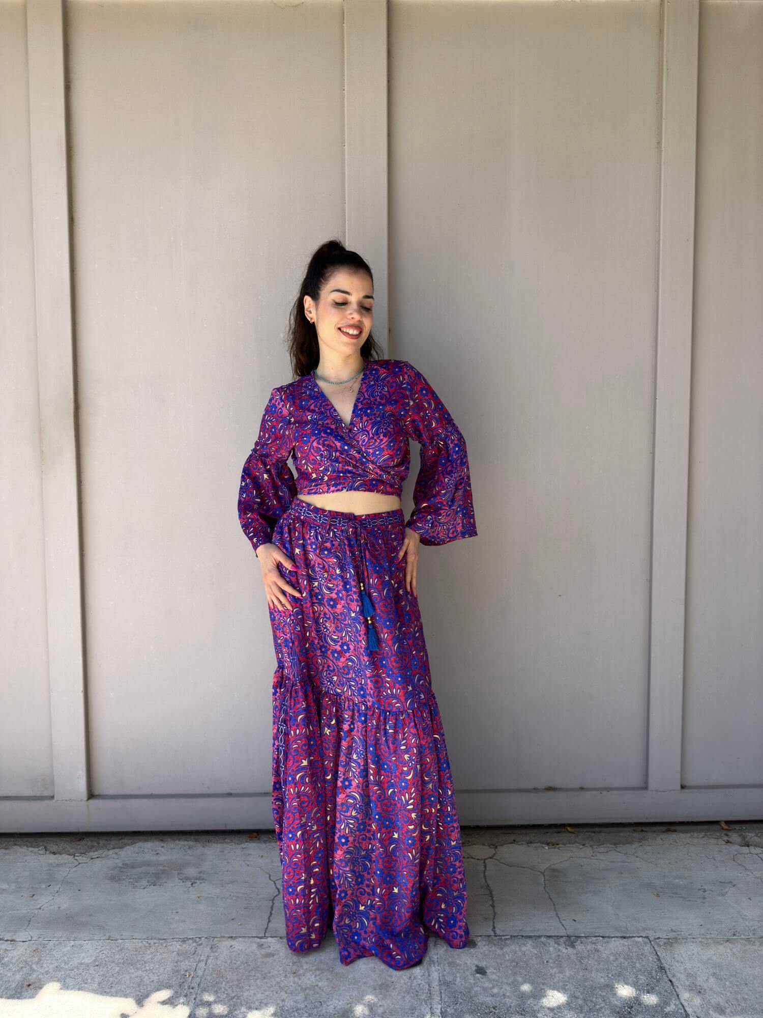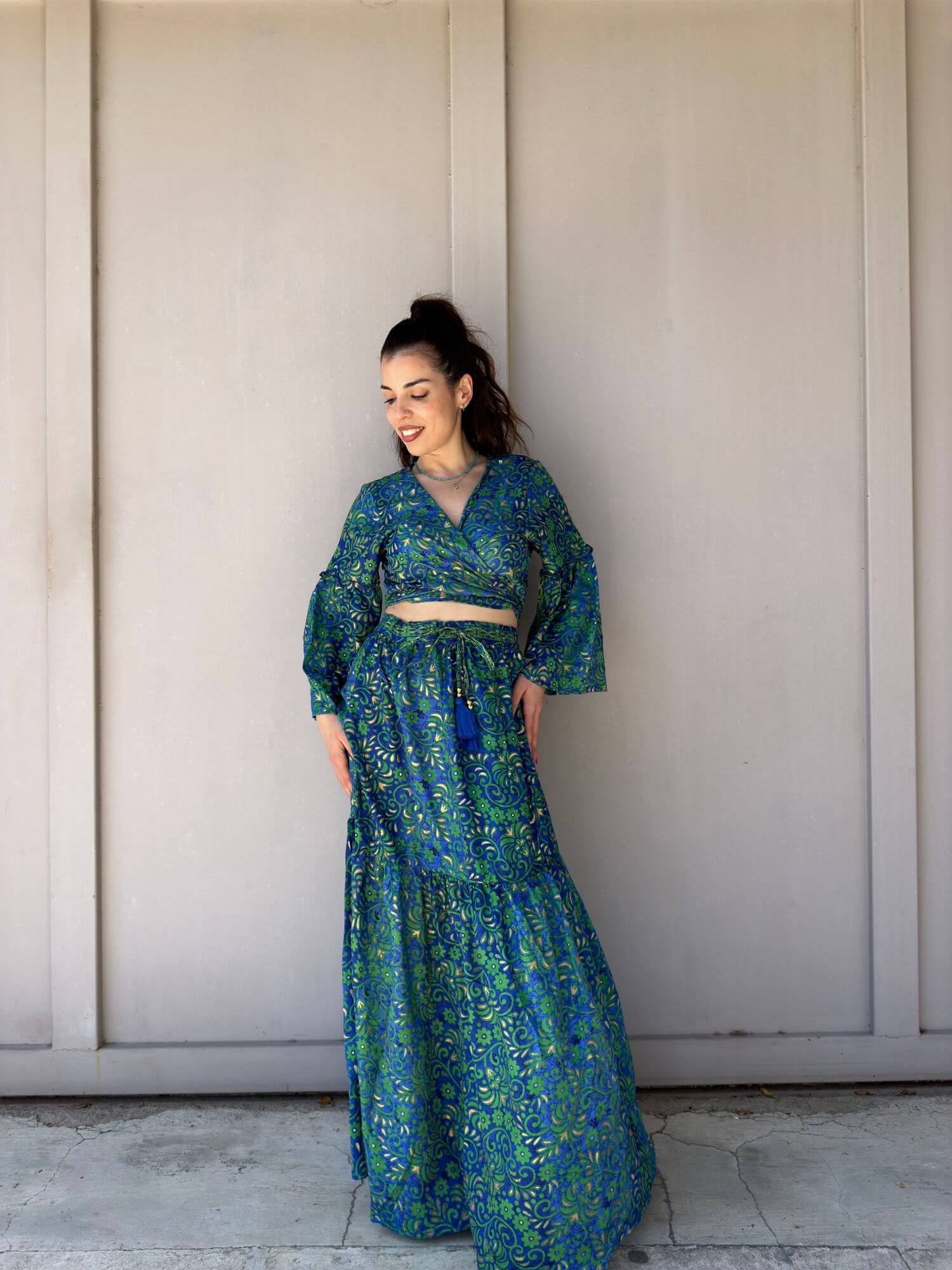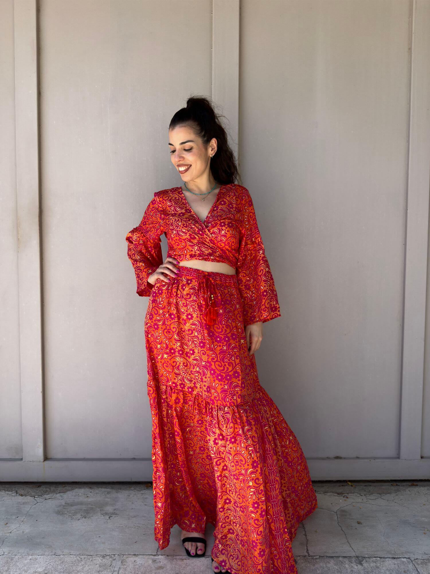 Σετ που αποτελείται από τοπ και φούστα σε άλφα γραμμή. Το ύφασμά του είναι μεταξωτό και η φούστα στην μέση έχει λάστιχο. Καλύπτει έως Xlarge.