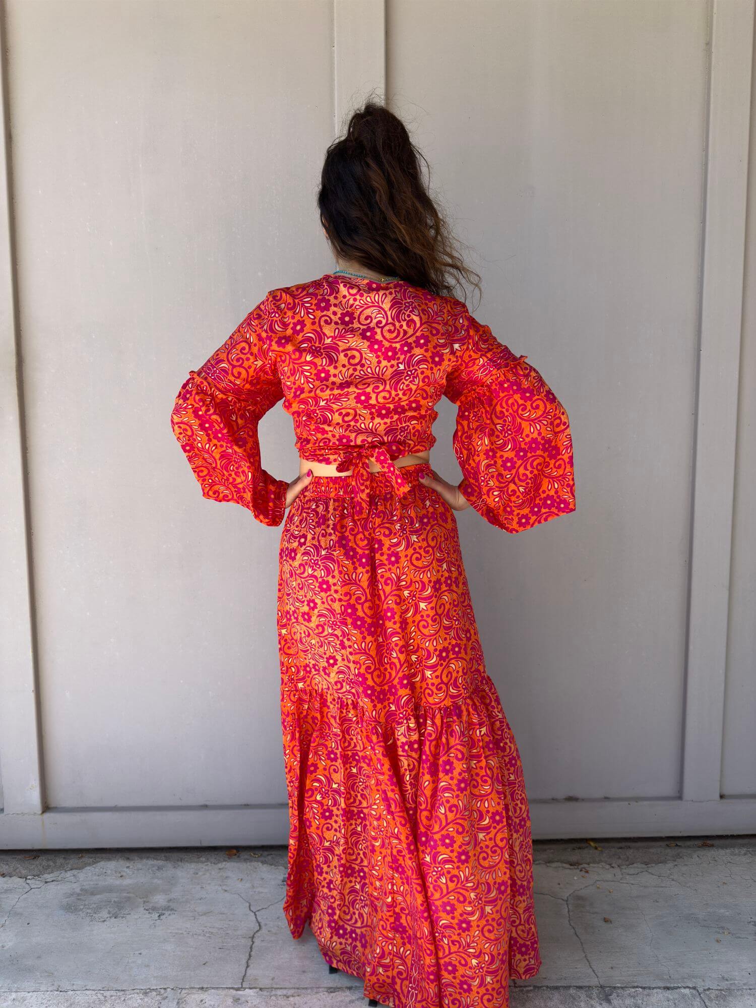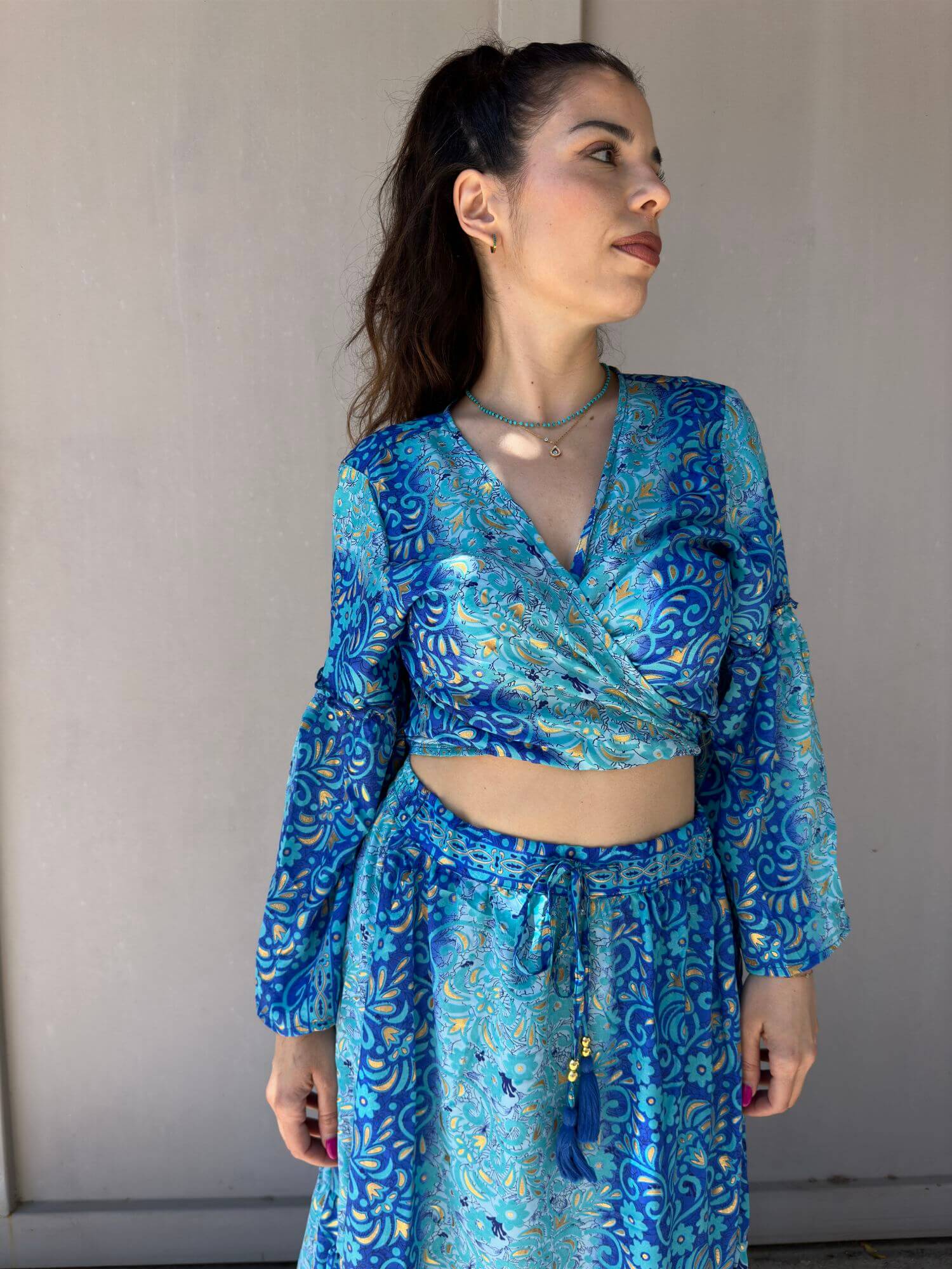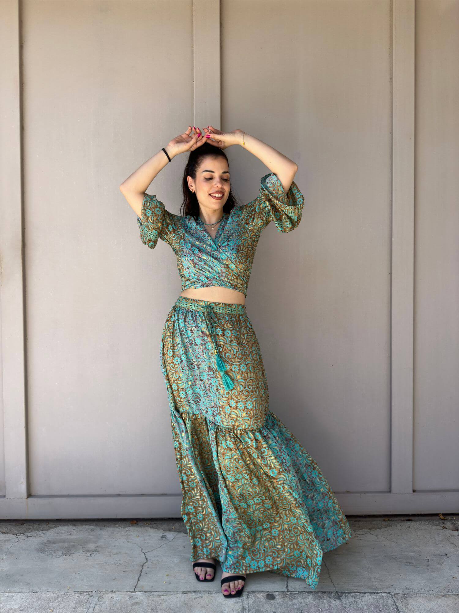 Σετ που αποτελείται από τοπ και φούστα σε άλφα γραμμή. Το ύφασμά του είναι μεταξωτό και η φούστα στην μέση έχει λάστιχο. Καλύπτει έως Xlarge.