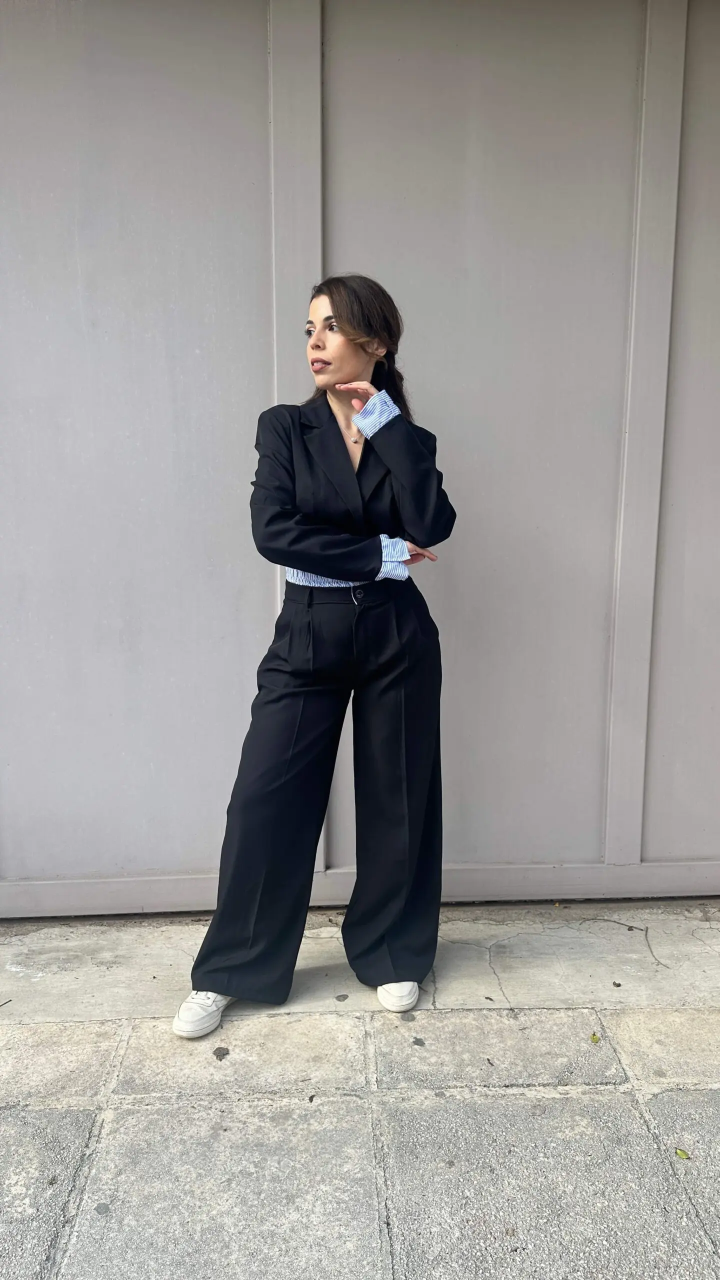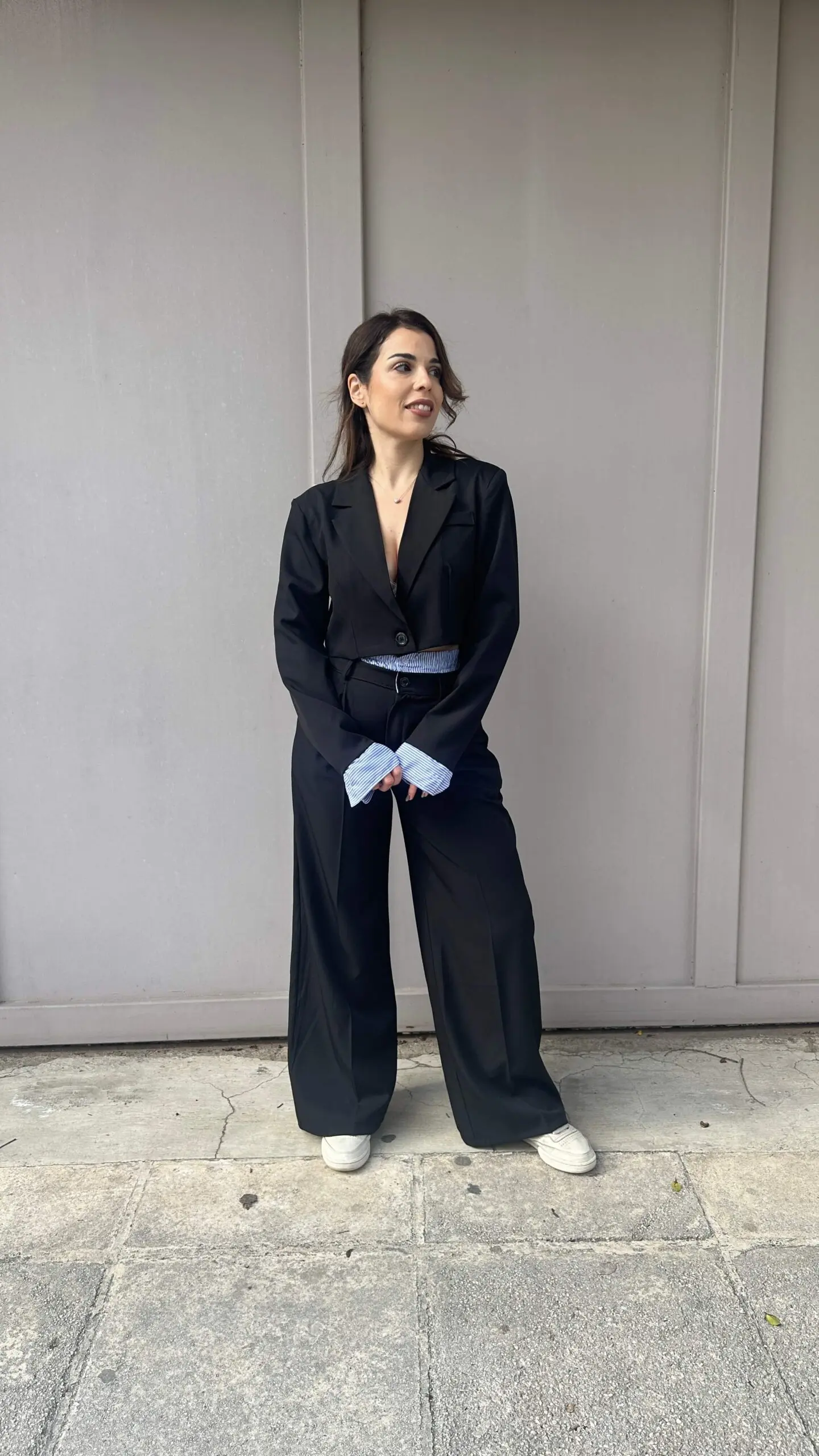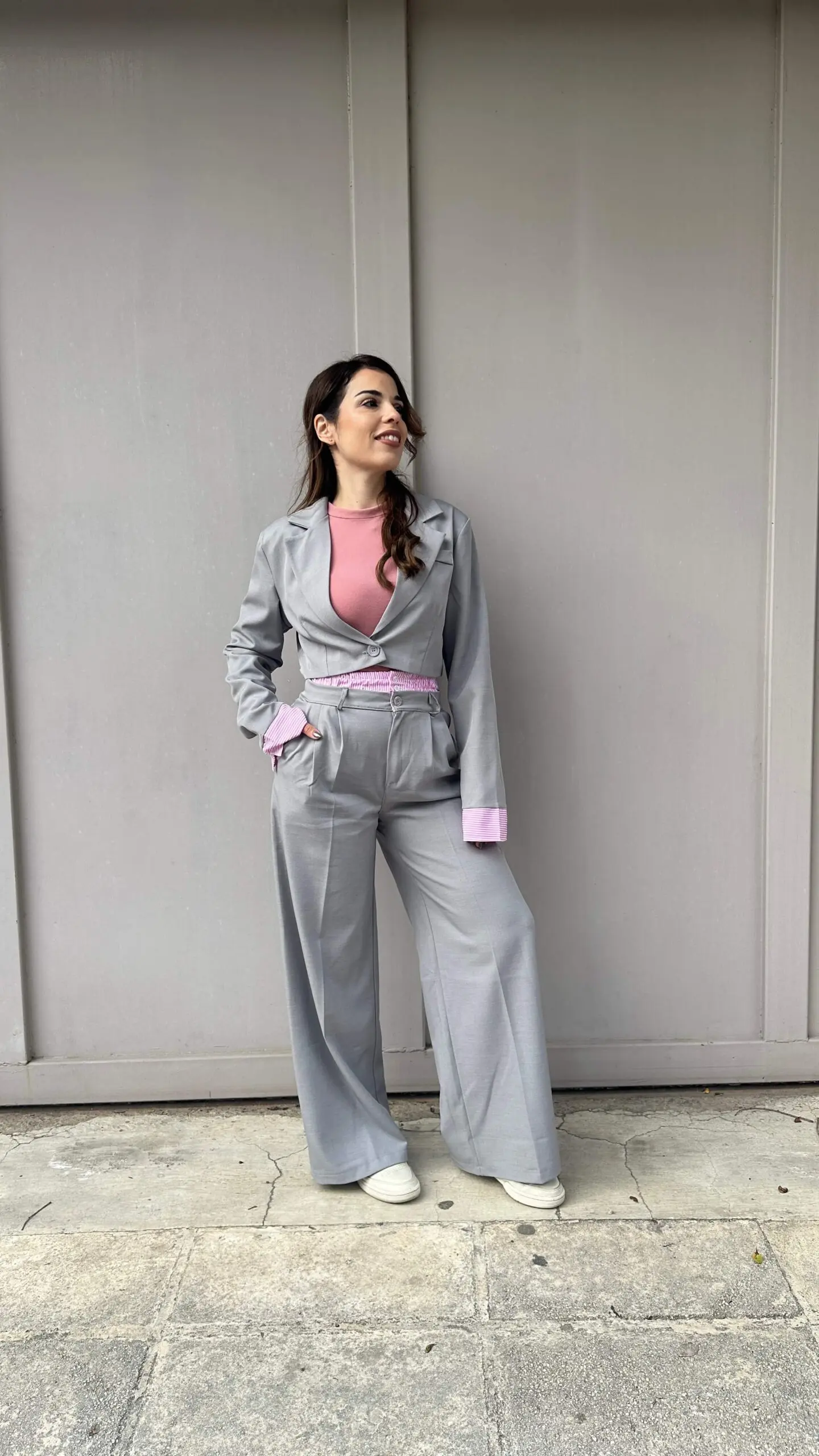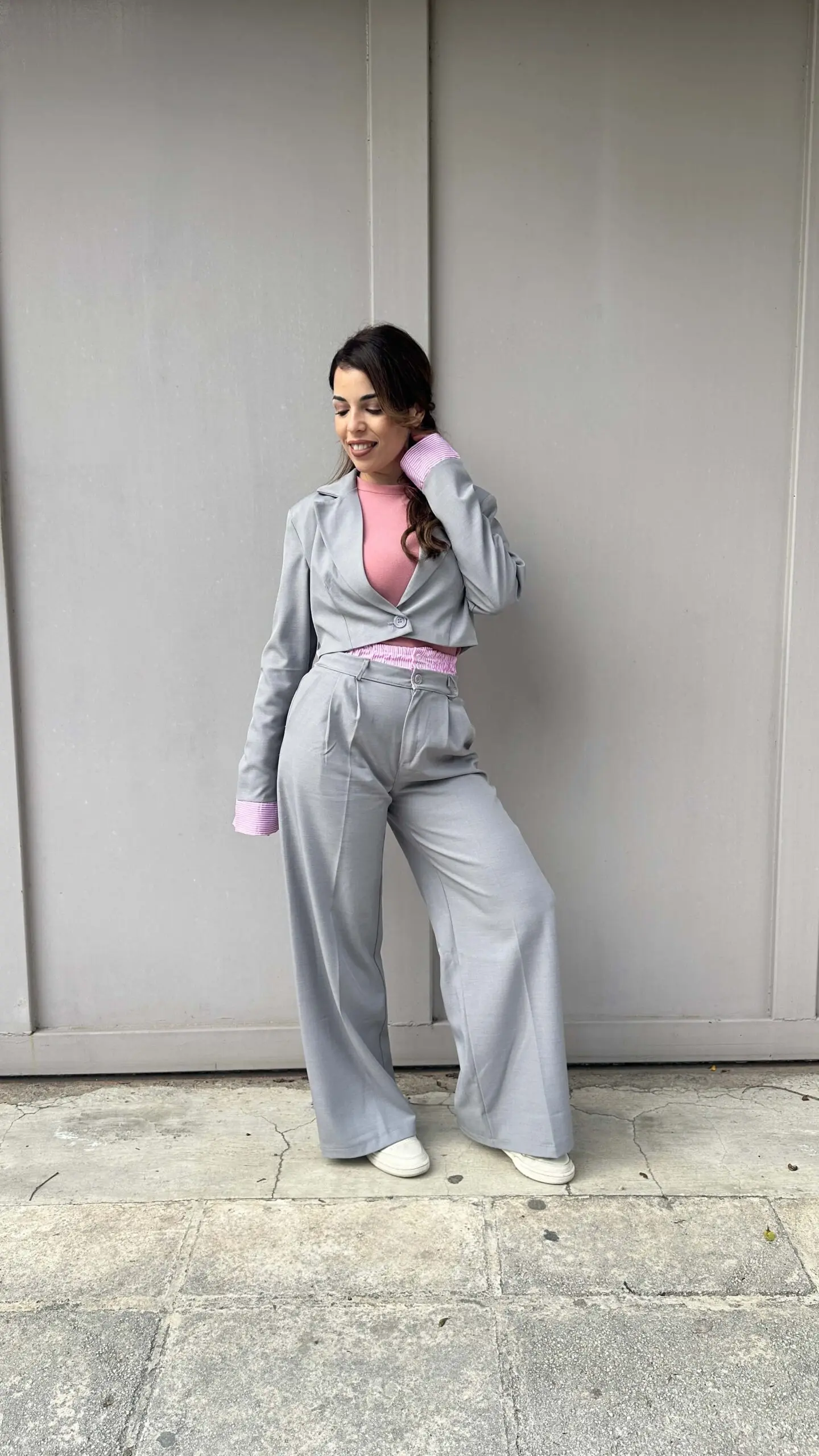 Κοστούμι που αποτελείται από κοντό σακάκι και παντελόνα. το σακάκι κλείνει με ένα κουμπί και στα μανίκια έχει γύρισμα με εφέ ρίγα.Το Παντελόνι είναι σε άνετη γραμμή και το λάστιχο στην μέση έχει εφέ ρίγα . Είναι one size και καλύπτει έως Large