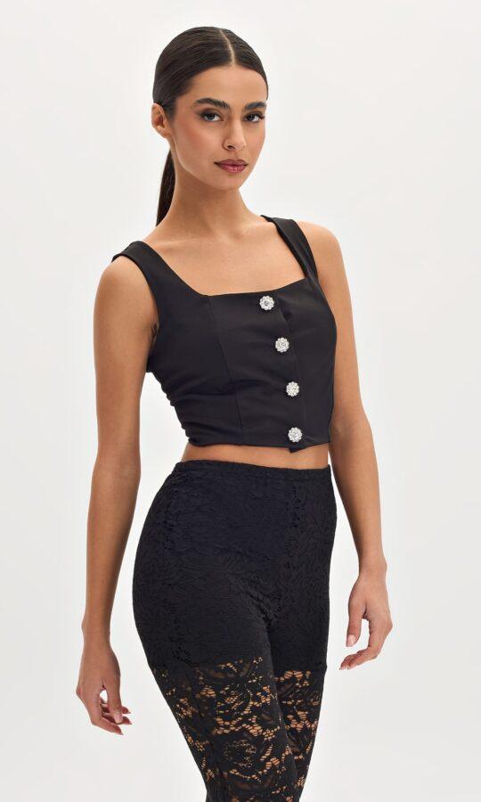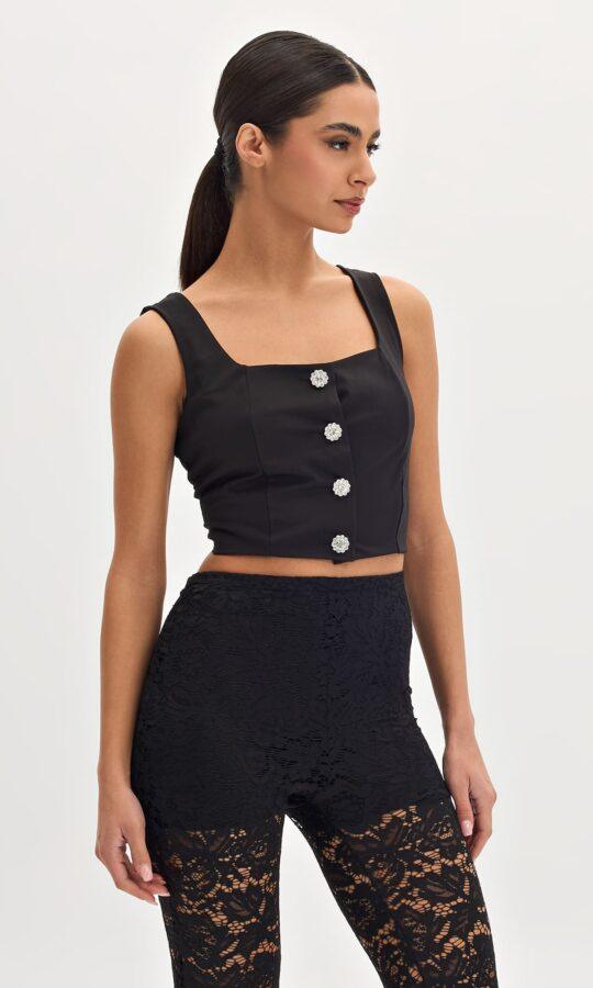 Cropped Top ραντάκι σε ελαστικό ύφασμα. Στο μπροστινό μέρος έχει διακοσμητικά κουμπιά. Καλύπτει έως Large