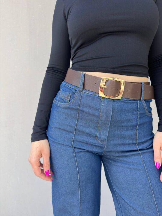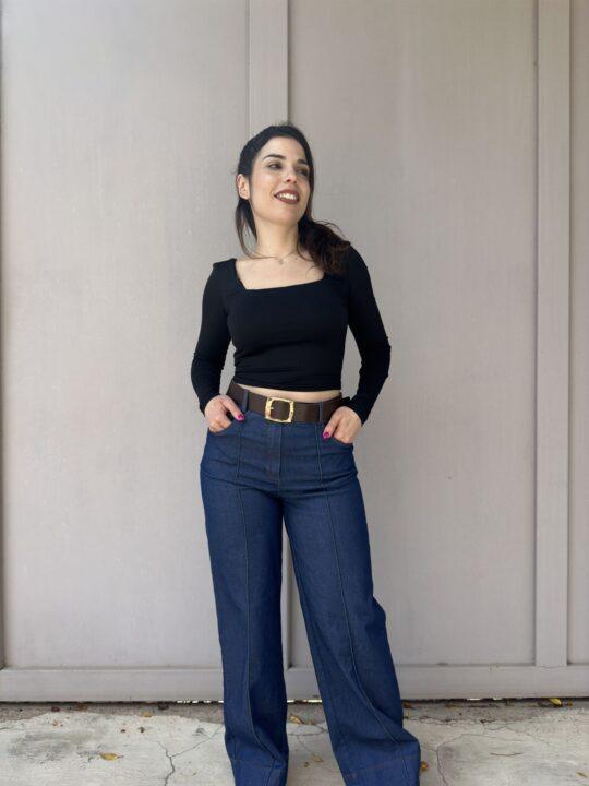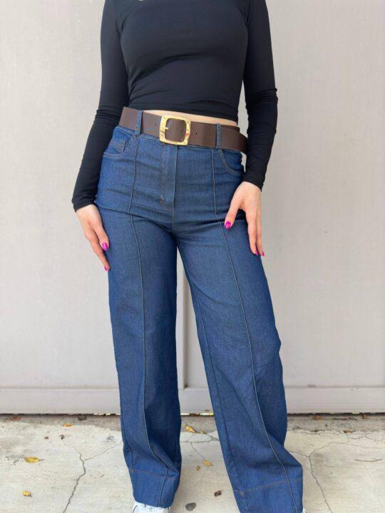 Παντελόνι σε ίσια γραμμή. Έχει λάστιχο στην μέση και διαθέτει δική του ζώνη. Είναι βαμβακερό και ελαστικό και στο κάτω μέρος κάνει ρεβέρ.