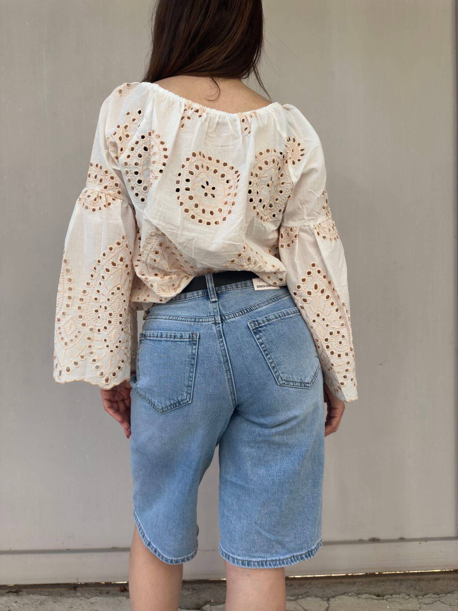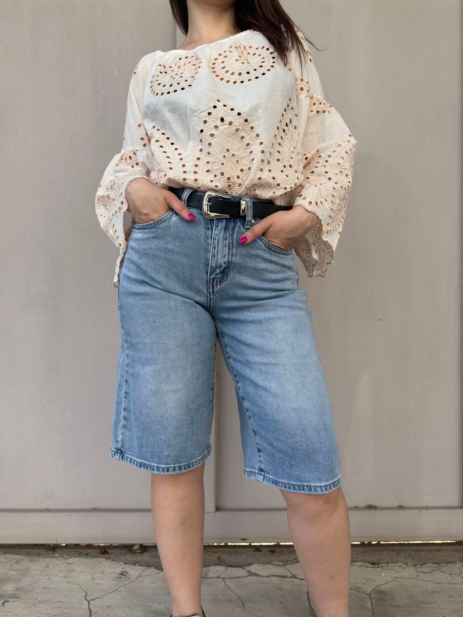Βερμούδα τζιν με τσέπες μπροστά και πίσω. Φτάνει μέχρι τις γάμπες και διαθέτει δική της ζώνη. Βγαίνει από Extra small έως Extra Large